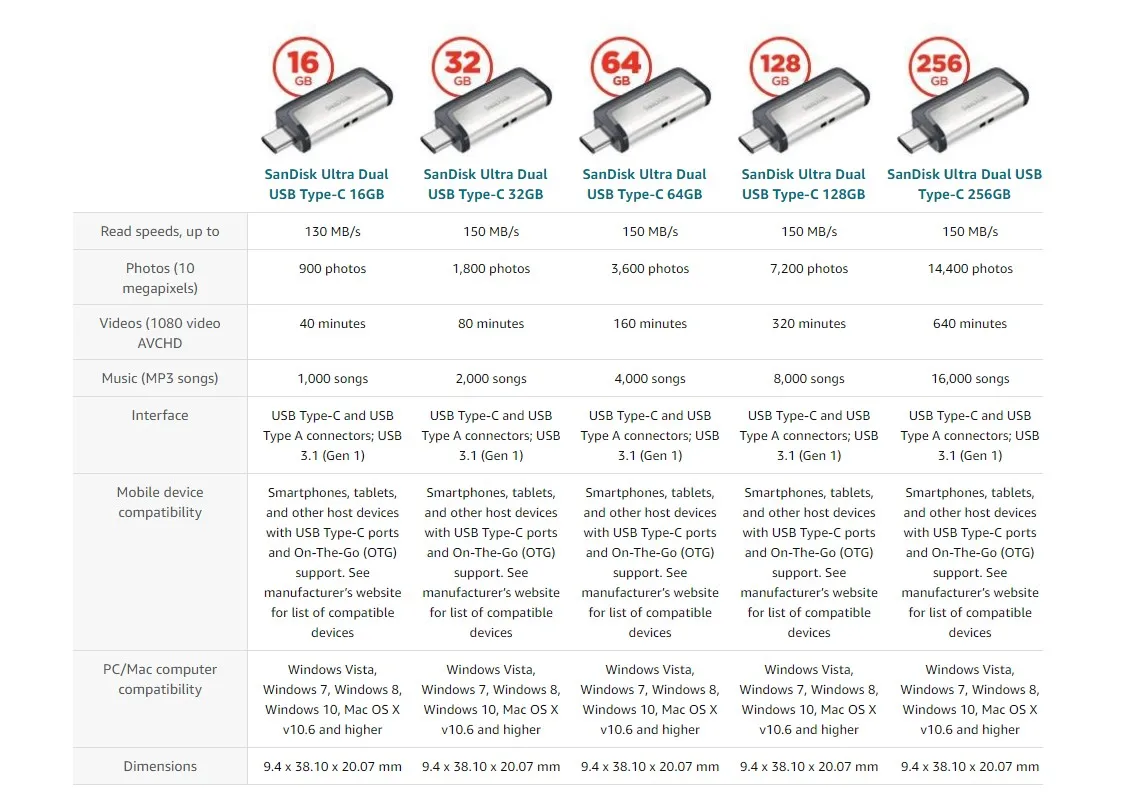Доступные емкости: 32 ГБ 64 ГБ, 128 ГБ 256 ГБ Производительность/скорость: скорость передачи до 150 МБ/с. (максимальный пик лаборатории SanDisk) *, скорость записи ниже Размеры: 0,79 "x 1,5" x 0,37" Рабочая температура: 32 ° - 113 ° F (0 ° - 45 ° C) Температура хранения: 50 ° - 158 ° F (-10 ° - 70 ° C) Совместимость: USB 3,1 (обратная совместимость с USB3.0/USB2.0)