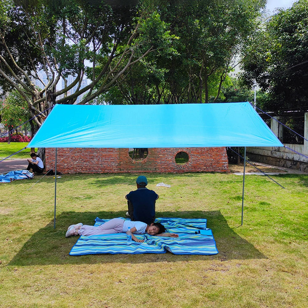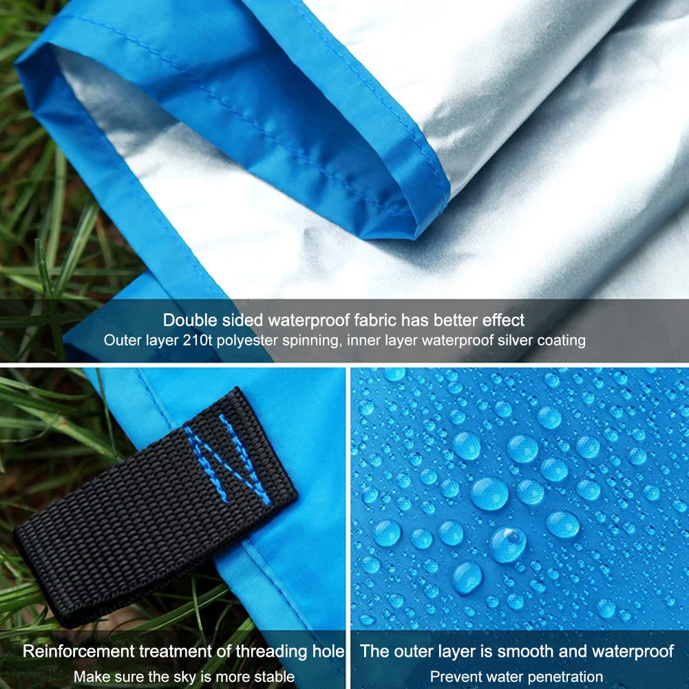 Наружный навес тент от солнца Многофункциональный водонепроницаемый садовый пляжный коврик для кемпинга дождевикХарактеристика:1. Светильник-вес, водонепроницаемый и универсальный, этот тент достаточно велик, чтобы обеспечить вам безопасное укрытие от внезапных ливней и создать сухое место сбора для влажных поездок.2. Многоцелевой, влагостойкий, водонепроницаемый, солнцезащитный, непромокаемый и другие функции, также может использоваться как напольный коврик, коврик, пляжный коврик, может использоваться в качестве палатки с навесом и ветровой веревкой.3. Веревка для дождя может быть широко использована в качестве спасательных брезентов, гамаков, наружных кухонных покрытий, самодельных палаток, следов палаток, земли и мгновенного оттенка.Спецификация:Материал: 210T водонепроницаемый полиэстер Спиннинг (полиэстер снаружи, серебро внутри)Цвет: камуфляж, синийРазмер: 300*300 см (синий), 290*300 см (камуфляж)Размер хранения: около 22*20*9 смПримечание:Камуфляжные модели не имеют серебряного покрытияПримечание:Возможны незначительные отклонения в размере из-за ручного измерения, различных методов измерения и инструментов.Изображение может не отражать фактический цвет изделия из-за различного фотографирования светильник, угол и дисплей монитора.