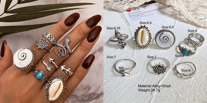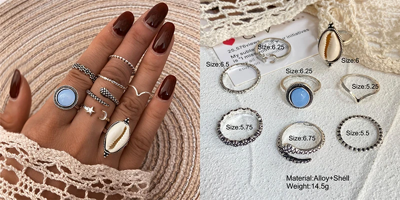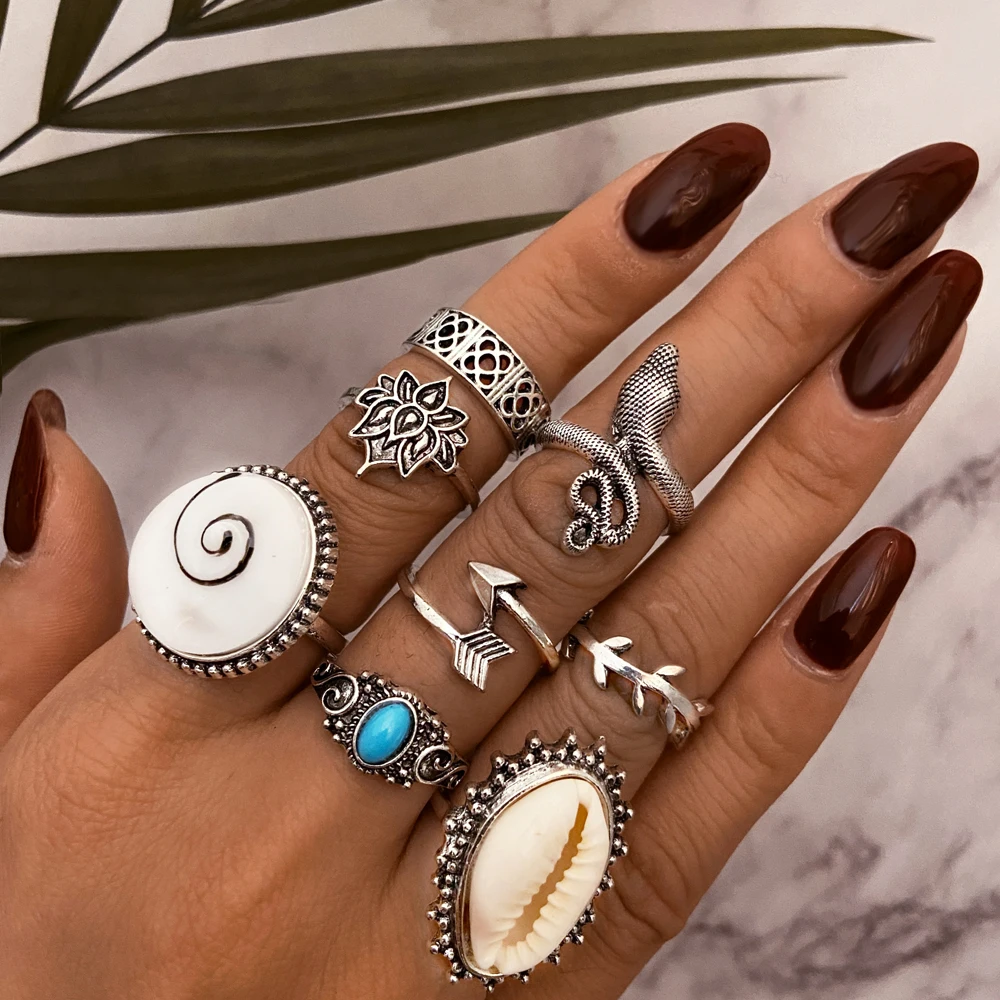 Этнический серебряный цвет Змеиный камень большой кольца ракушки комплект для женщин Луна костяшки кольца для пальцев 2021 новые ювелирные изделия