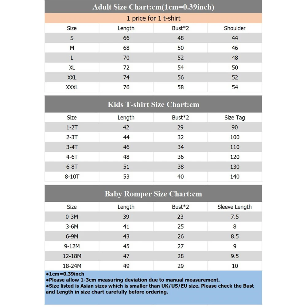1. Цвет: черный/белый/розовый/серый (см. Фото)2. Пожалуйста, имейте в виду, что цвет может немного отличаться из-за различных эффектов монитора и светильник.3. Указан Азиатский Размер s, который меньше, чем размер Великобритании/США/ЕС. Пожалуйста, внимательно проверьте обхват груди и длину перед заказом.4. Обратите внимание: если ваш ребенок пухленький, мы рекомендуем выбрать больший размер.Посылка: 1 рубашка для взрослых или 1 детский комбинезон или 1 Детская рубашка/сумка разных стилей.Примечание: цена указана только за одну штуку!В: как разместить заказ на весь Семейный комплект (Футболка для девочки + футболка для мамы)?О: например, Детские От 2 до 3 лет размеров для девочек, размер M для взрослых для мамы,Нажмите на детский размер От 2 до 3 лет => Добавить в корзину=> Продолжить покупку=> Добавить Взрослых M В корзину=> Перейти в корзину=> Отправить заказ=> Оплатить вместе(Если у вас есть какие-либо проблемы, пожалуйста, немедленно свяжитесь со мной)