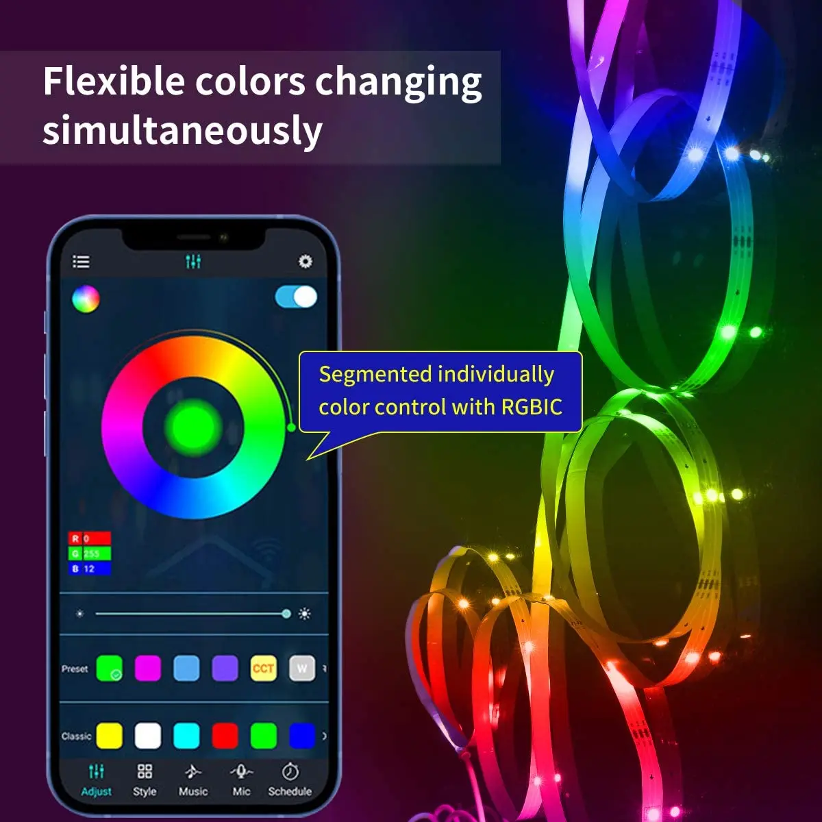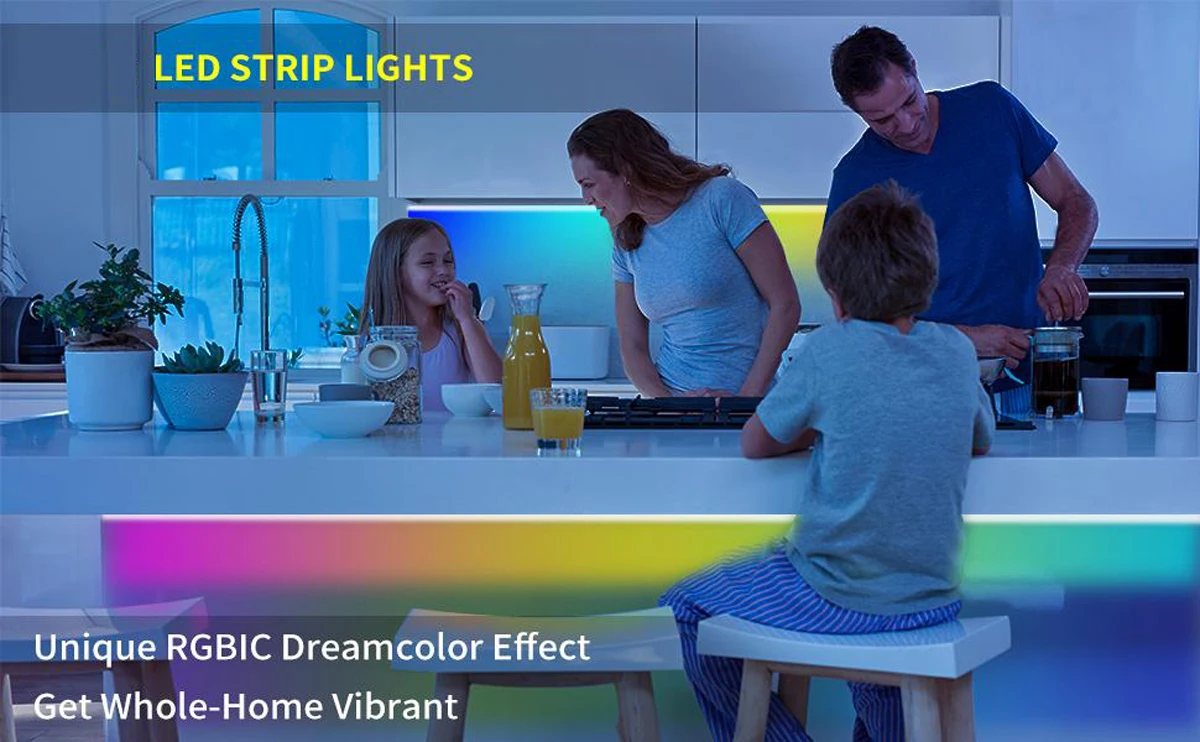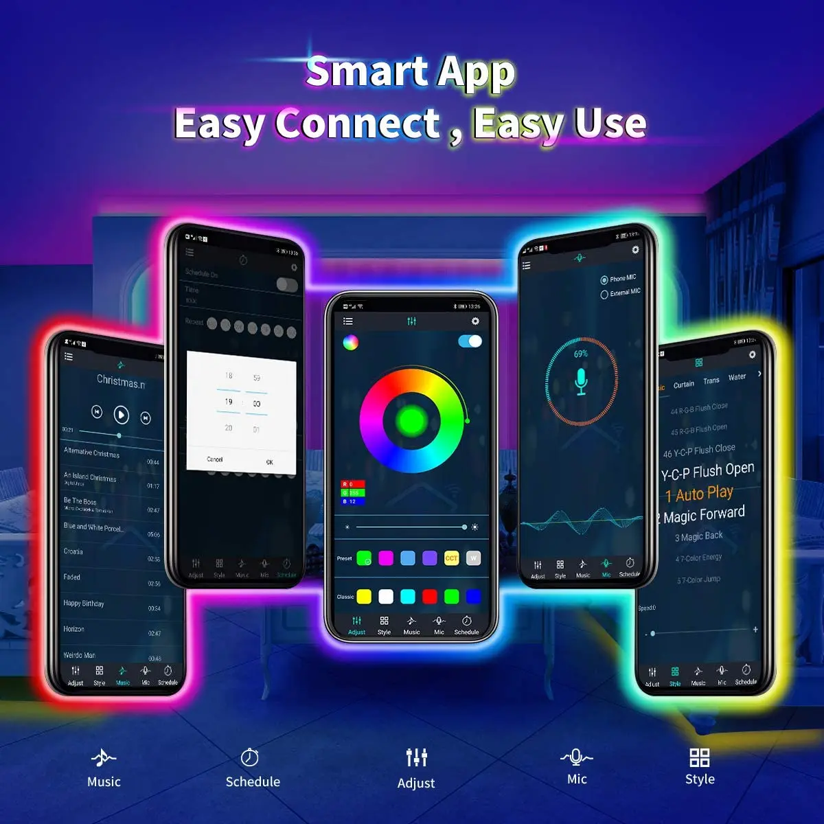 Три кнопки используются для изменения цвета, переключения и изменения режима, длительное нажатие кнопки переключения, чтобы выключить световую ленту. Встроенный микрофон, световая лента может танцевать с музыкой или другим голосом.