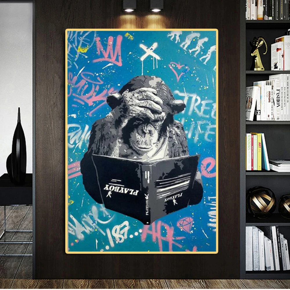 Абстрактная красочная животная живопись современный граффити обезьяна читать книги настенное искусство смешная картина Куадрос холст плакат печать домашний декор