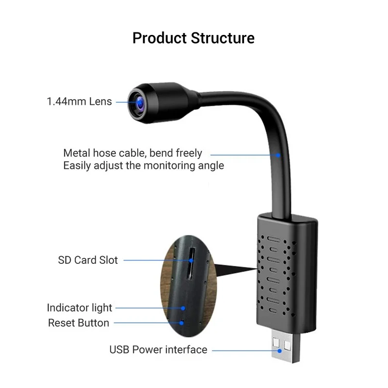 Особенности: 1) Разрешение: 720P 2) Аудио: Встроенный микрофон, одностороннее аудио 3) Формат видео: AVI 4) Угол обзора: 150 ° 5) угол вращения: 360 °, гибкий металлический шланг, легко регулировать угол обзора 6) Тип карты памяти: tf-карта (8G-128G не входит в комплект), облачное хранилище 7) обнаружение движения, сигнал тревоги 8) Просмотр смартфона 9)Wifi, может просматривать в любое время в любом месте удаленно