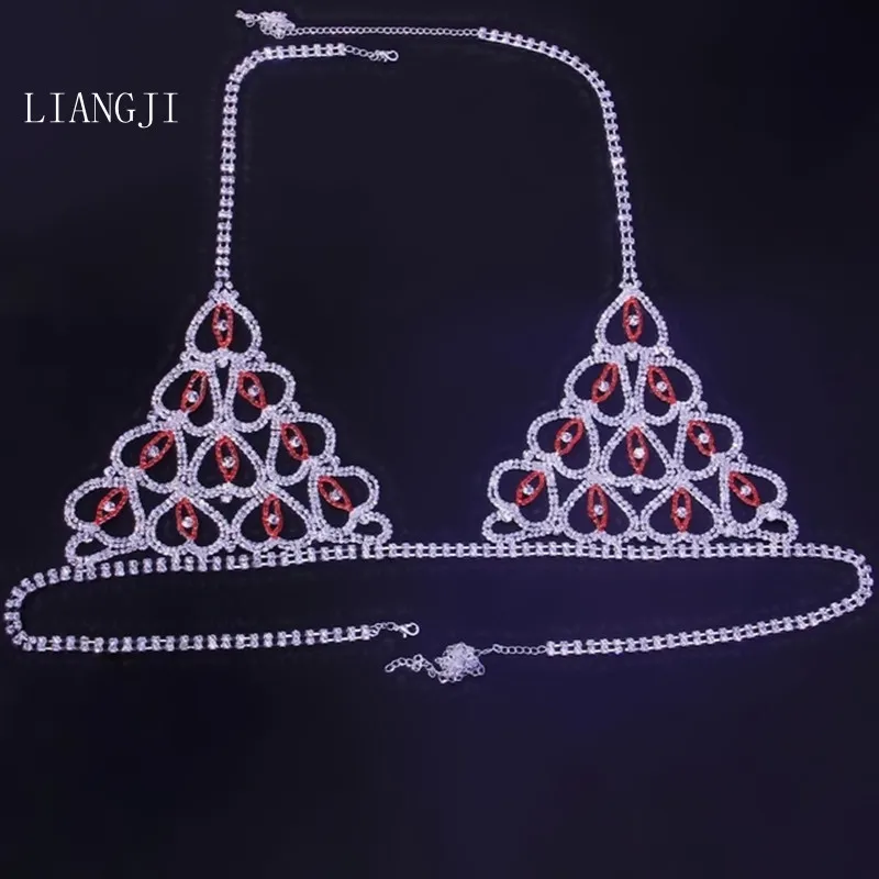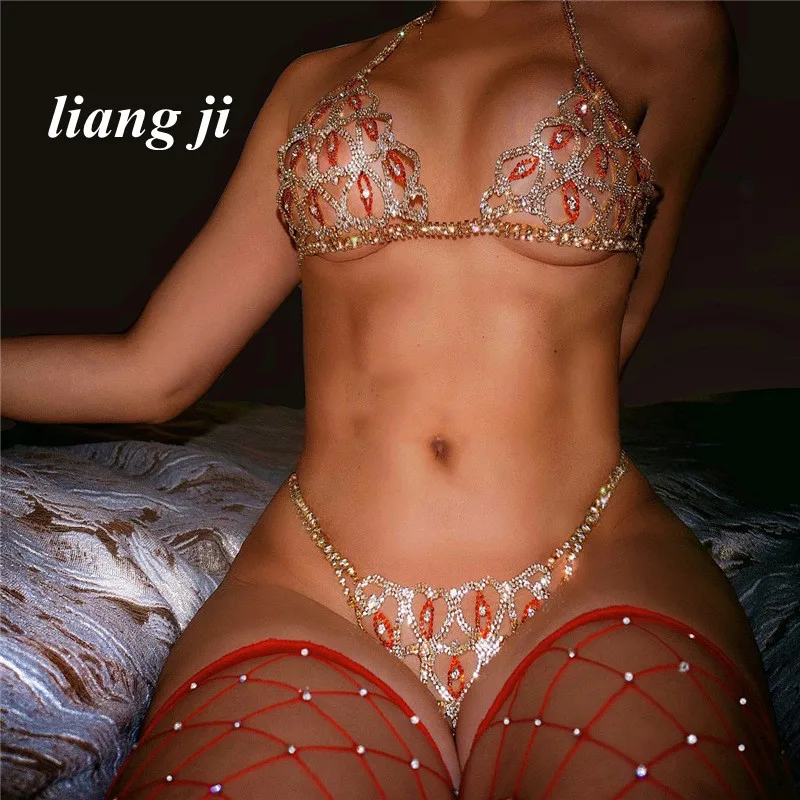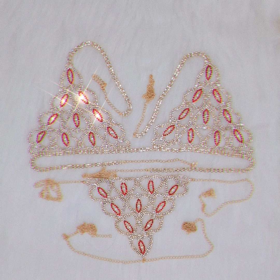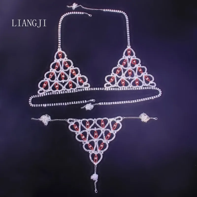 Комплект бикини с тремя кристаллами, ювелирное изделие в европейском и американском стиле, пикантное ювелирное изделие с открытой спиной, цепочка на грудь, бюстгальтер, трусы с Т-образным вырезом