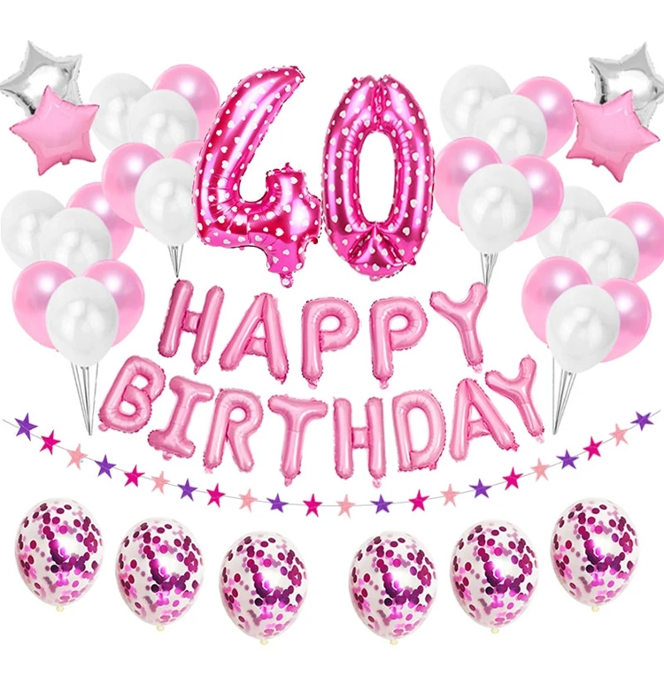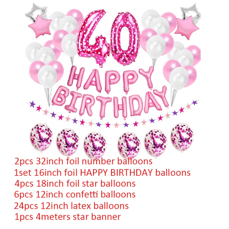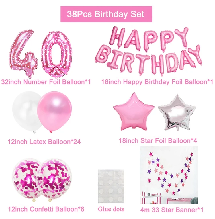32 дюйма фольги номер 40 шары1 комплект 16 дюймов фольга письма с поздравлениями с днем рождения воздушные шары4 штуки, 18 дюймов воздушные шары из фольги в форме звезды6 шт. 12 дюймов конфетти воздушные шары12 шт 12-дюймовые прозрачные перламутровые латексные шары12 шт 12-дюймовые розовые латексные шары1 шт 4 метра бумажный Звездный баннерБаллонные клеевые точкиПримечание:Будет разница в цвете между цветом воздушного шара и изображением, прежде чем он будет надут.