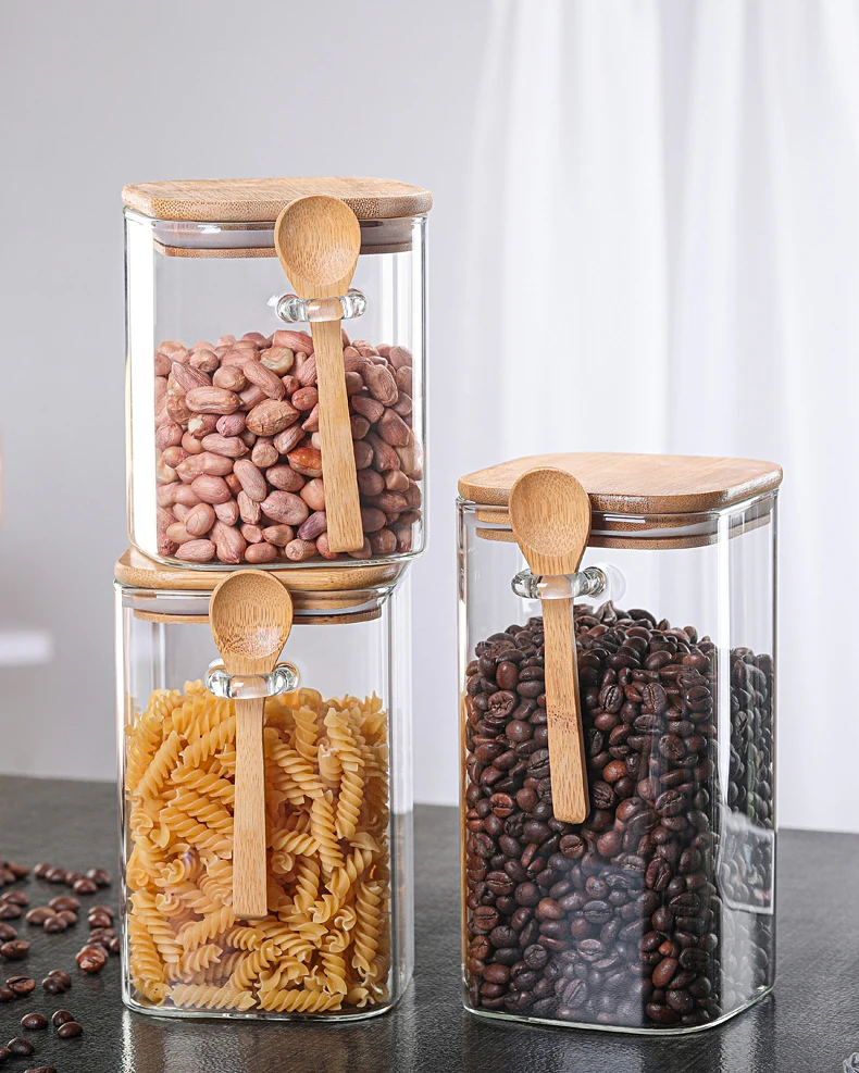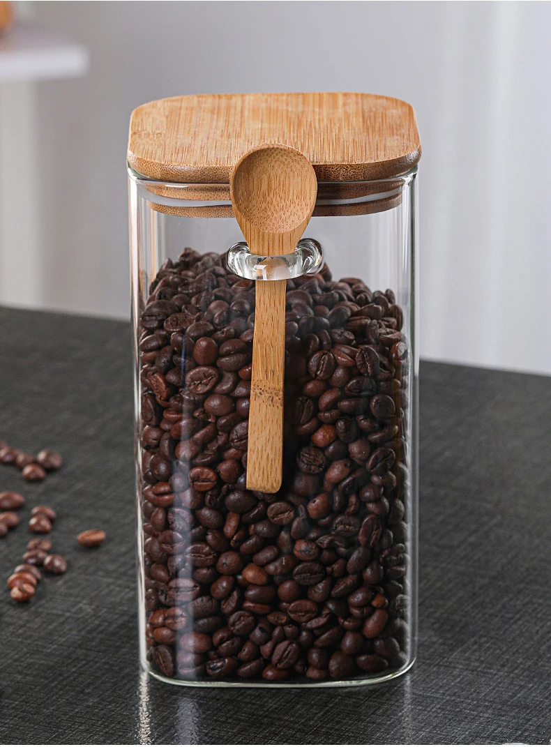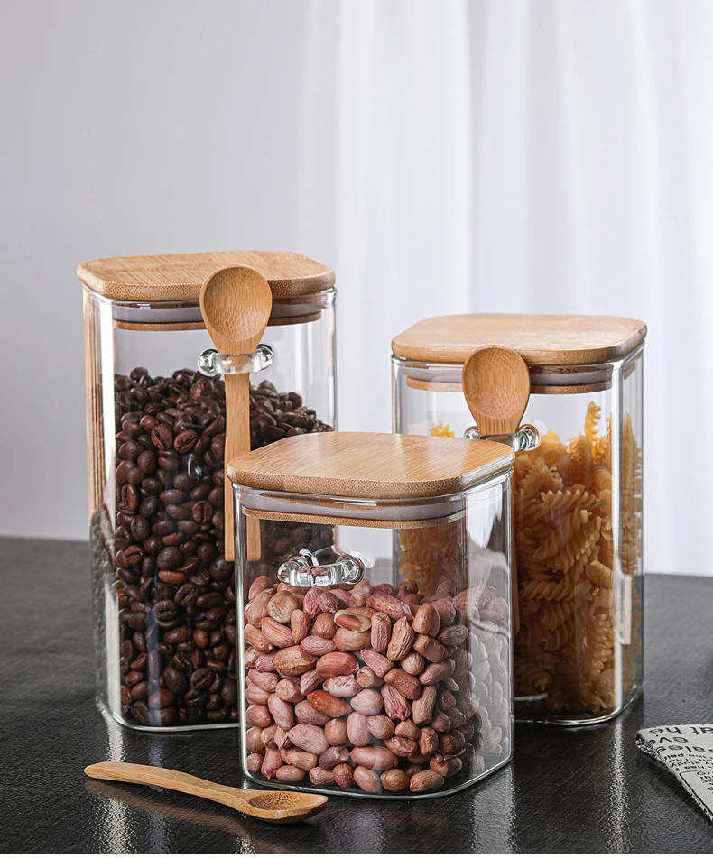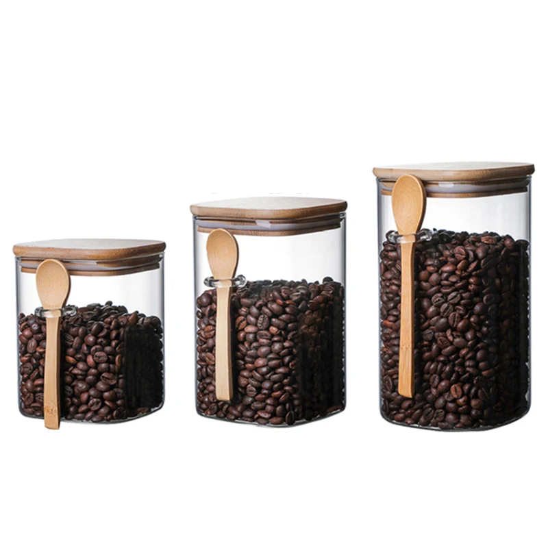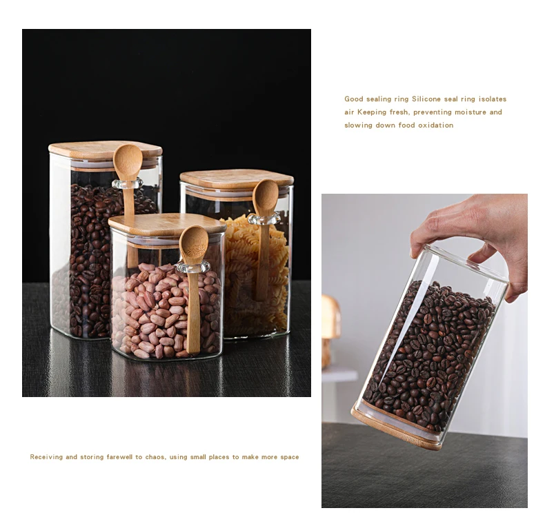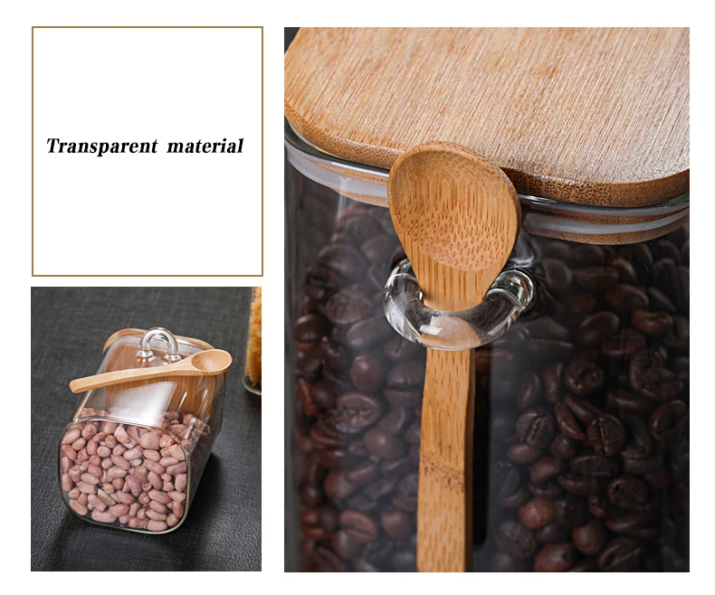 Герметичная банка из боросиликатного стекла с ложкой, Бамбуковая крышка, емкость для хранения кофейных зерен, чая, приправ, разнообразная бутылка для хранения