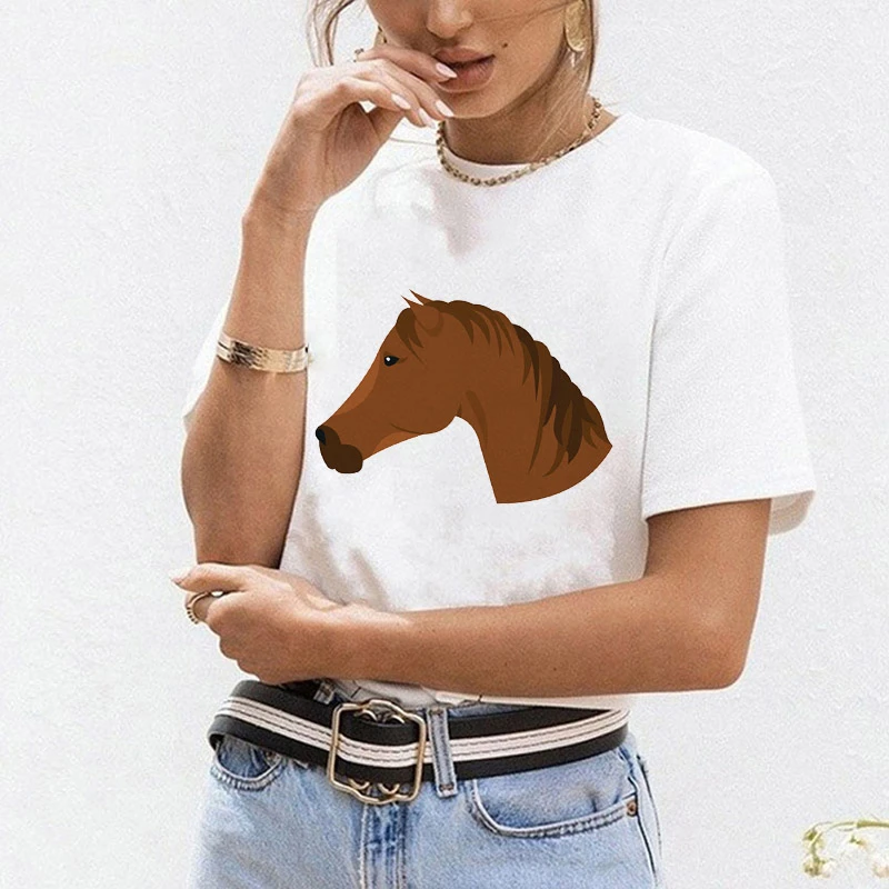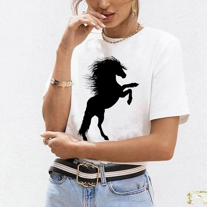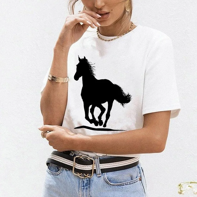 Футболка женская с графическим принтом лошадей, модная повседневная рубашка в стиле Харадзюку, с коротким рукавом и круглым вырезом, лето 2021