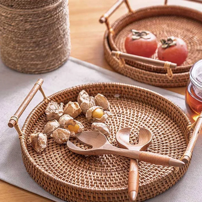Плетеный ротанговый поднос для хранения, деревянная круглая плетена...