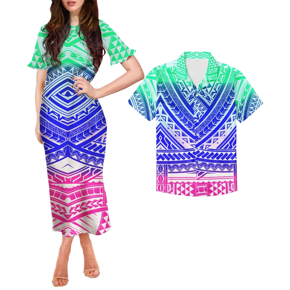 Красное градиентное желтое зеленое племенное полинезийское племенное платье для пары Дизайнерская Женская обтягивающая Макси-платье с коротким рукавом подходит к Shir