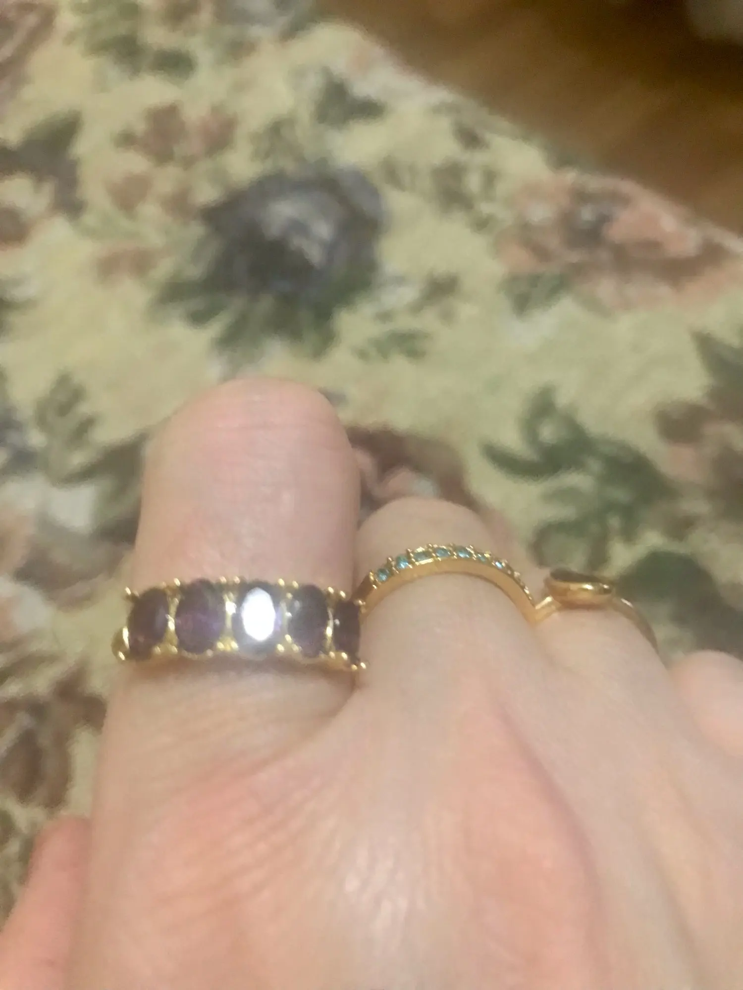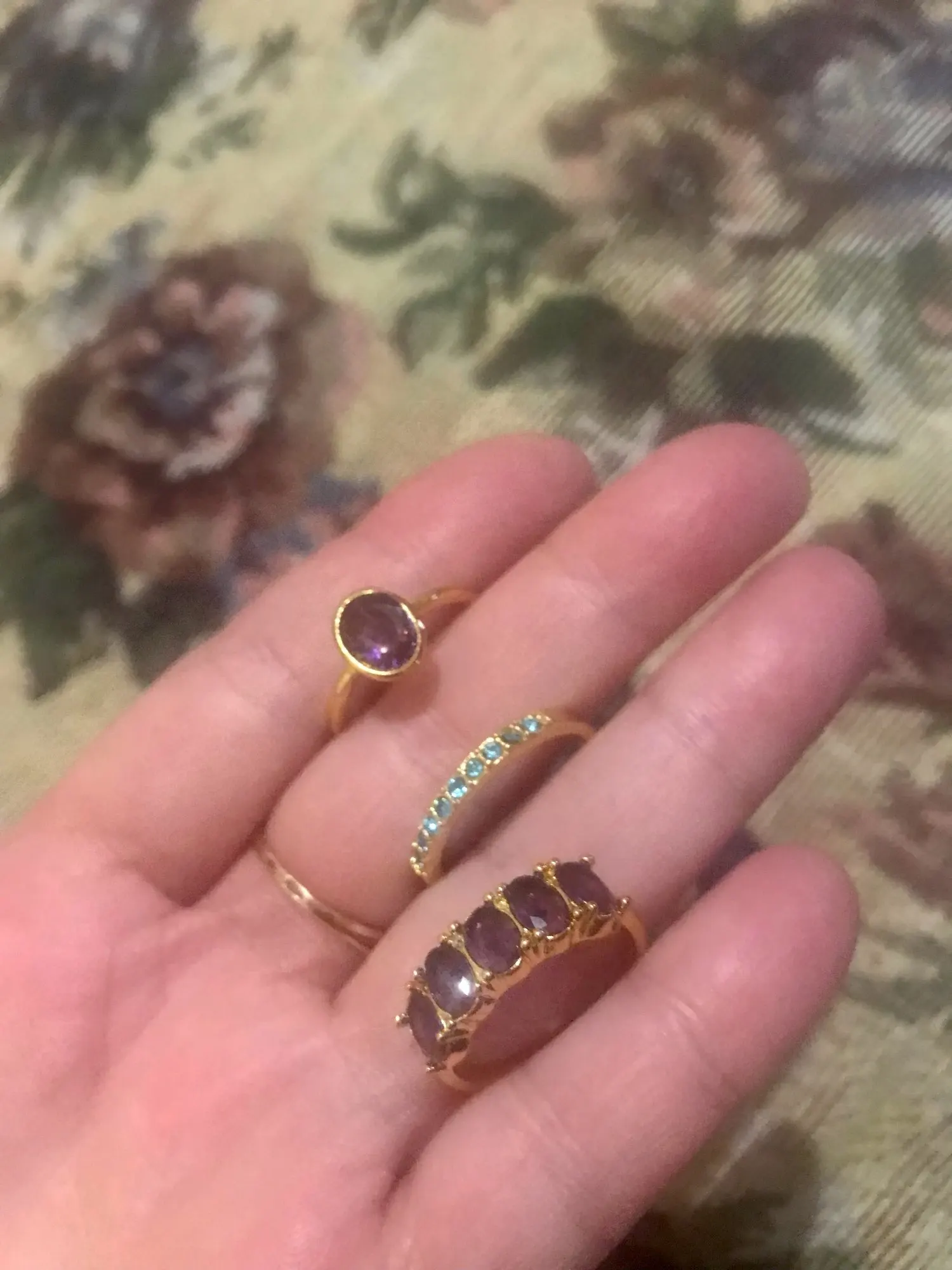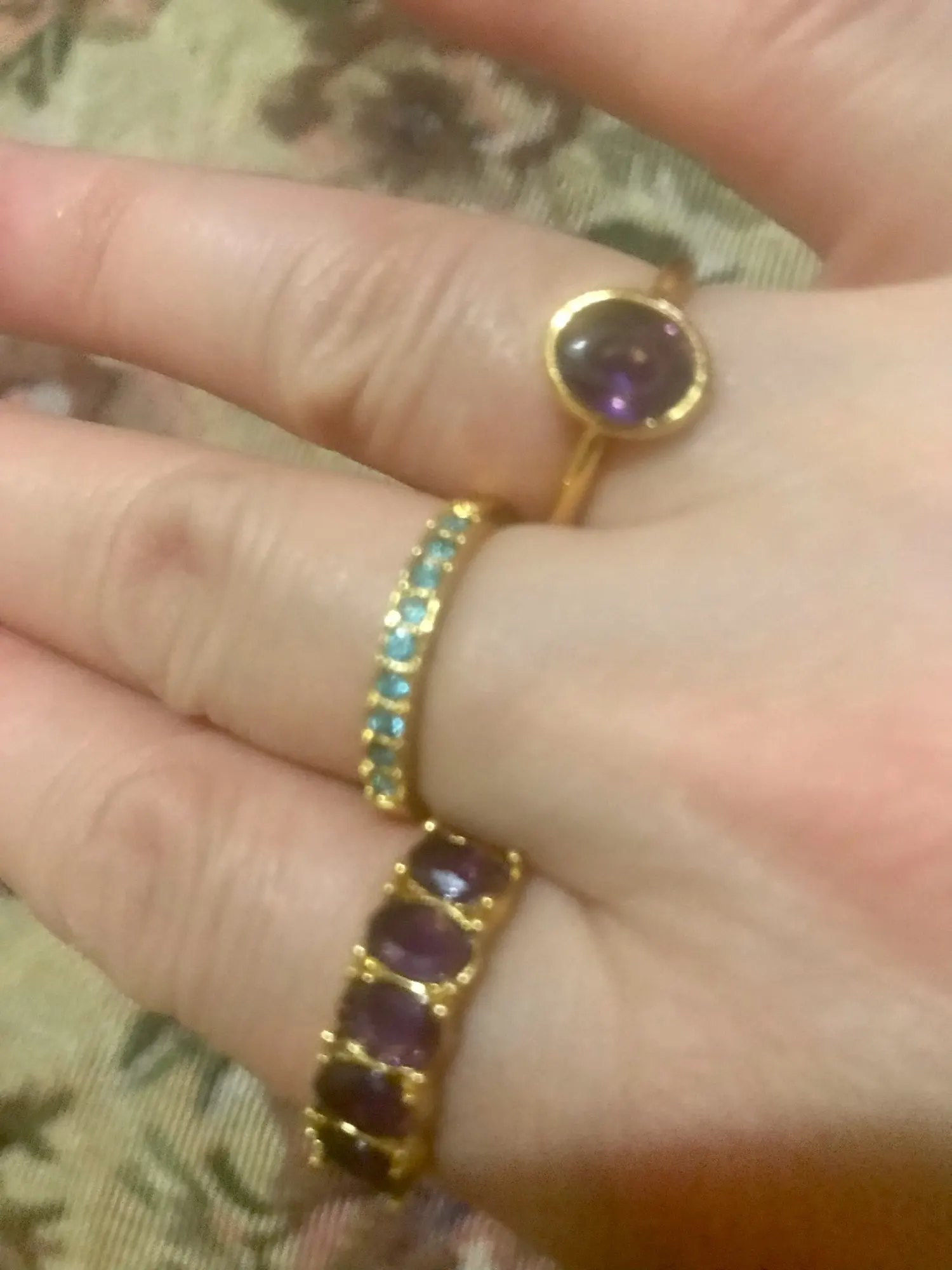 Точно такие же красивые, как и на фото! Очень понравились! Похожи на золотые с аметистовыми камнями и очень аккуратные. С удовольствием буду одевать. Вот только их надо заказывать на размер меньше. Я заказала 8 размер, на средний палец, но они мне оказались велики, на 9 размер. Я не растерялась, и разрезала их ножницами большими и сделала из них разъемными , на любой палец. Хочу ещё заказать, на запас, если эти облезут, так как хочу одевать их чаще. Очень мне понравились. Рекомендую прекрасные колечки, отличного продавца , прислал быстро и отличный магазин. Процветания вам всем и благополучия. Спасибо!