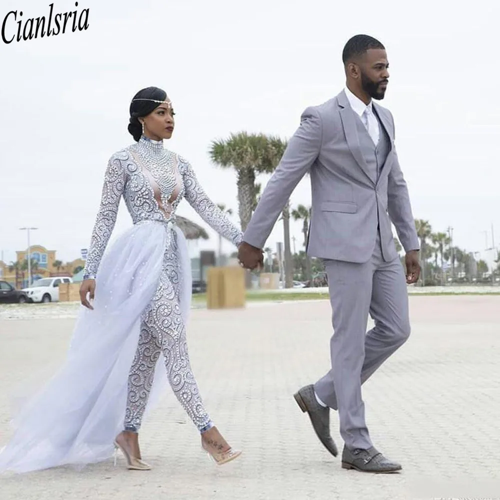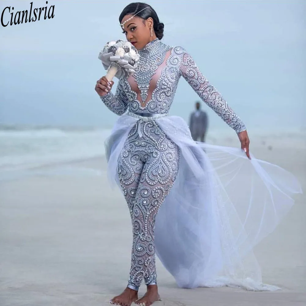 Женский комбинезон со съемным шлейфом, Свадебный комбинезон с высоким воротом и длинным рукавом, украшенный бусинами, 2021