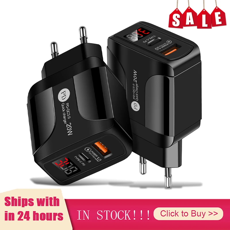Зарядное устройство с двумя портами 20WPD + QC, цифровой дисплей, экран для быстрой зарядки, аксессуары для телефонов с зарядкой для США, ЕС, Великобритании