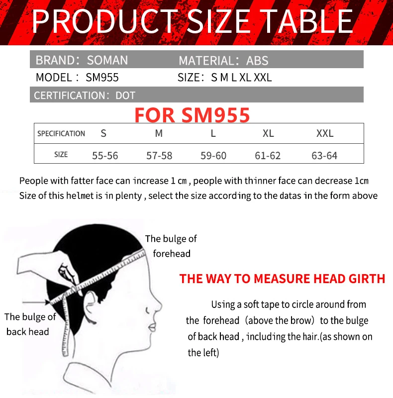 Brand: SOMANModel: 955,965955 Approved: DOT,GB965 Approved: ECE,DOT,GBBuckle: Quick Release BuckleMaterial: ABS Shell,PC Lens, EPS FoamLiner: Detachable and Washable LiningVisor: Smoke inner visor, Anti glare visorBluetooth Language: EnglishHelmet Style: modular helmet,full face helmets, flip up capacete,racing cascosMotorcycle Equipments: helmets,capacete,casque,kask,casco motoOccassion: motorcycle street riding,highway riding955 Helmet Size: S(55-56cm), M(57-58cm), L(59-60cm), XL(61-62cm), XXL(63-64cm)