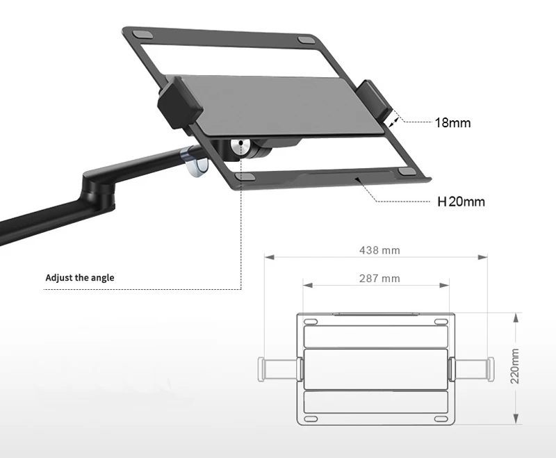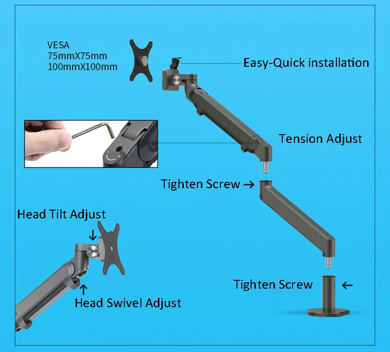 Технические характеристики :>>>Номер модели: OZ-1SМатериал: алюминиевый сплав + ABSПодходит для ноутбука до 17-32 "LCD/Monitor или 12"-17 "(ширина экрана от 287 мм до 438 мм)В посылка входит как пластина для ноутбука, так и кронштейн VESA.С структурой воздушного пресса, легко перемещается вверх/внизВращение головы: 360 °Наклон головы вверх/вниз: 90 °/-55 °Головка поворачивается влево/вправо на 360 °С кабельной системой, чтобы скрыть кабелиМаксимальная нагрузка: 2-8 кг для экрана и 2-8 кг для ноутбукаМонтажное отверстие VESA: 75x75 мм/100x100 ммЦвет: темно-серый/серебристо-серыйДва способа установки: Настольный зажим и креплениеУстановка втулки: для диаметра отверстия> = 60 ммУстановка зажима: для толщины стола от 20 мм до 60 мм