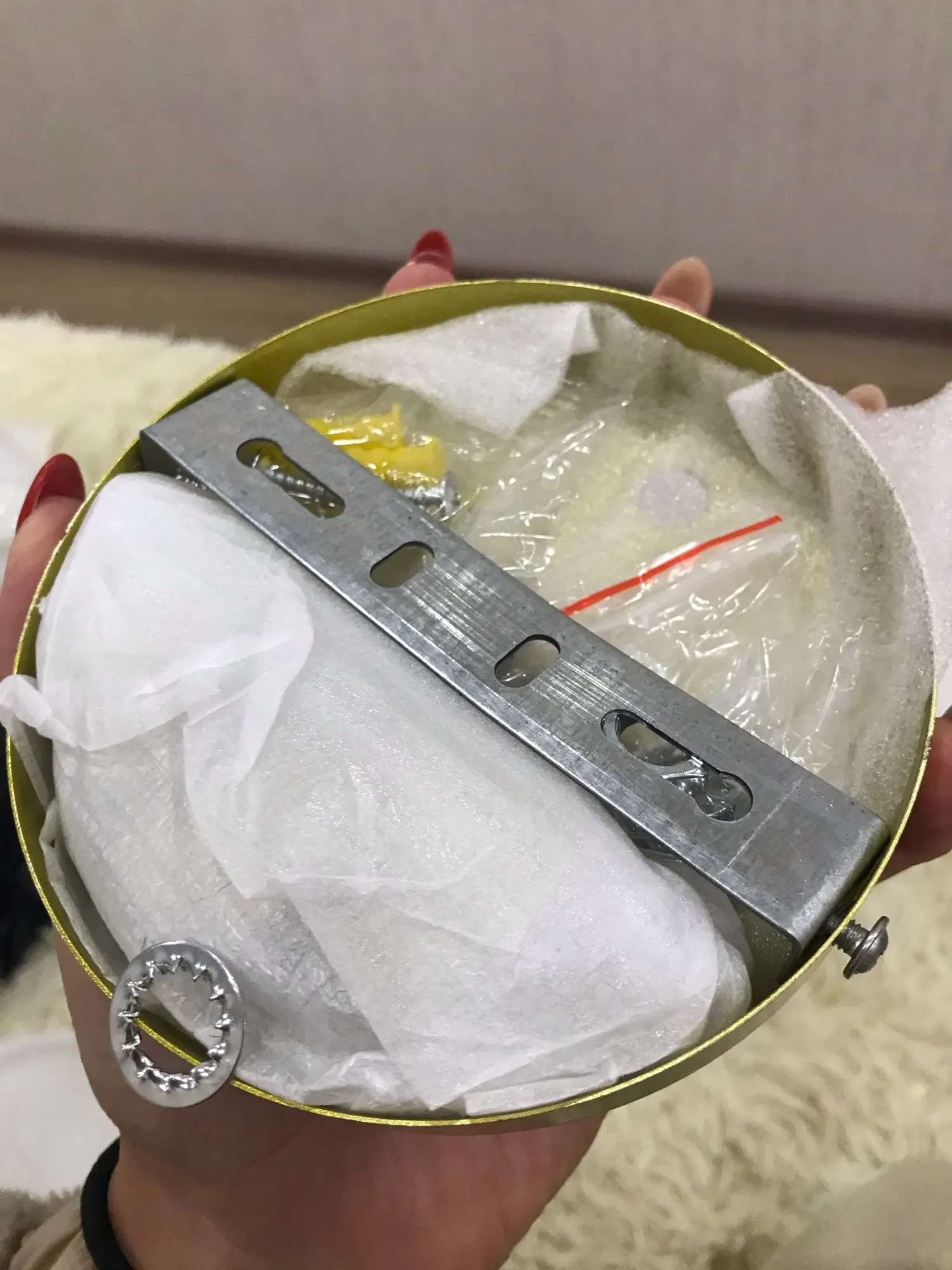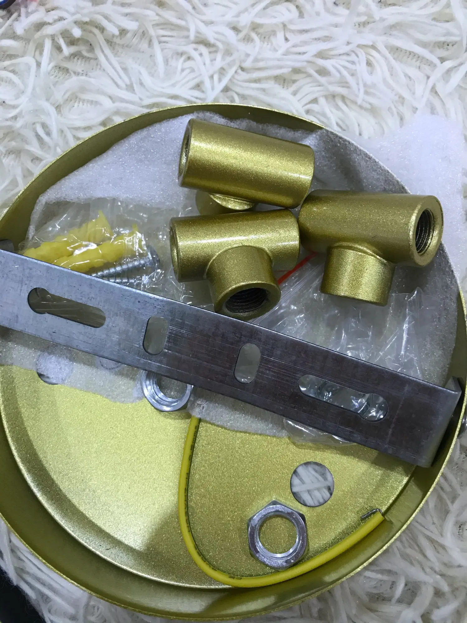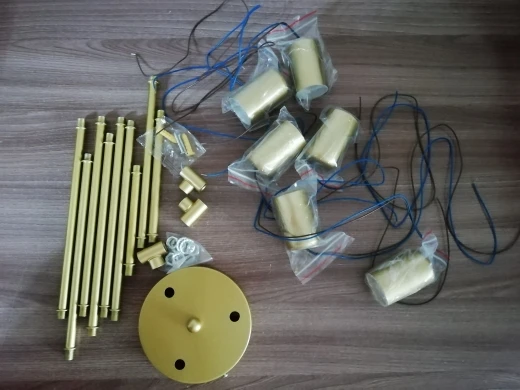 Посылка шла в Украину около 2 недель,доставлена на Укрпошту.Люстра нормальная,единственное имеются небольшие недостатки окрашивания,проступает чёрная основа,и пару сколов,в целом не критично.Цвет,наверное ,назвать можно как желтый металлик.Продавец после отправки посылки прислал на почту ссылку с видеоинструкцией по сборке.