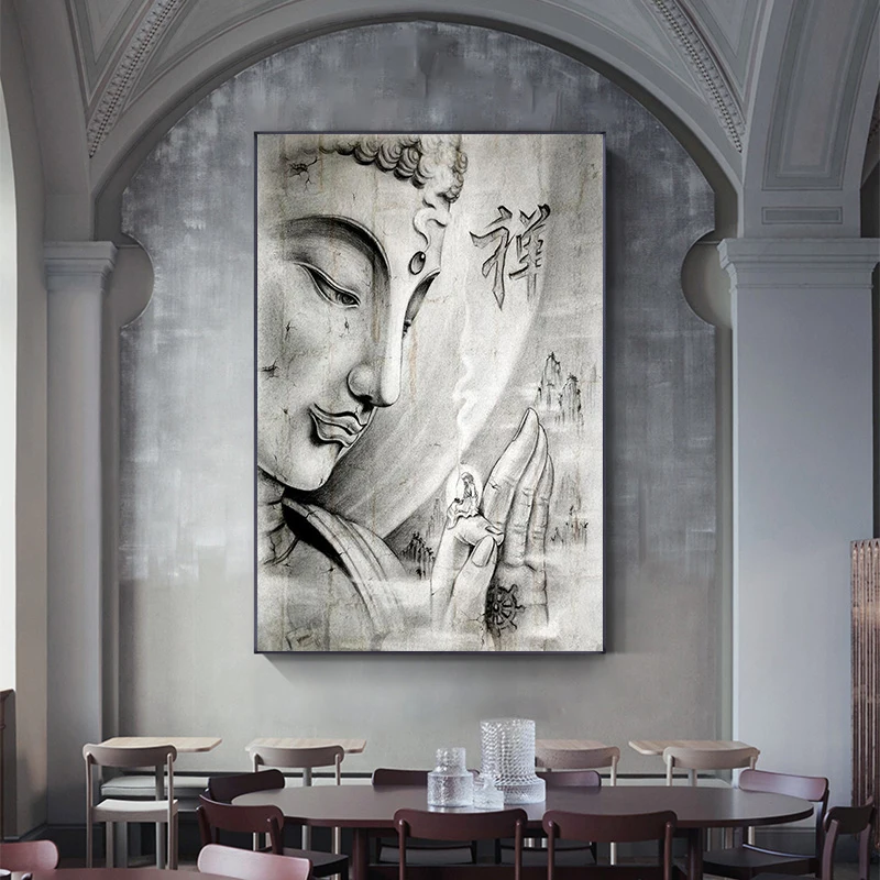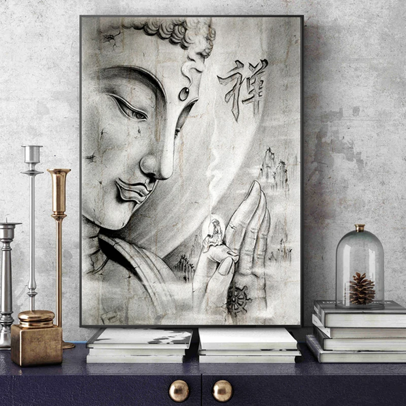 Абстрактная черно-белая статуя Будды, живопись на холсте, скандинав...