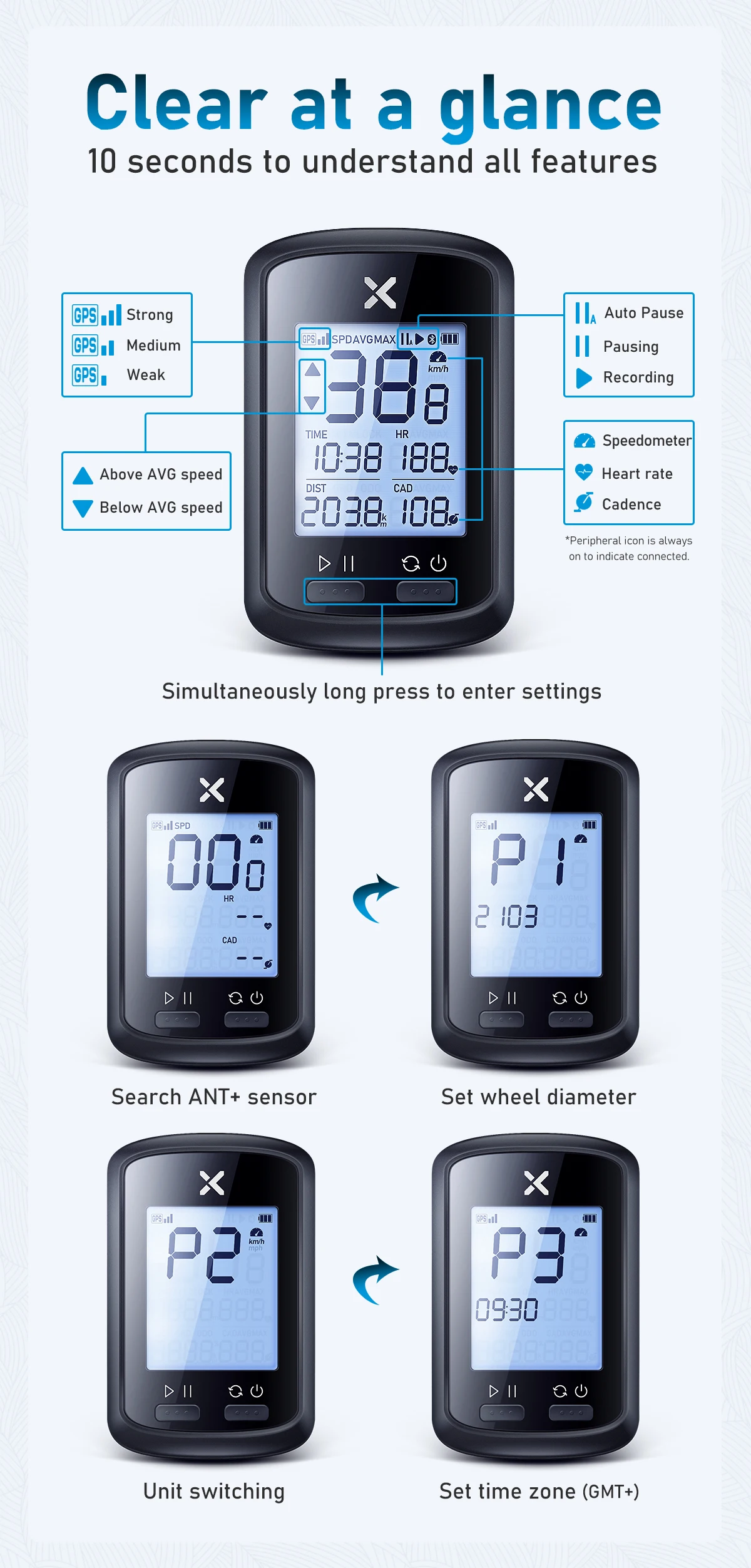 Обратите внимание: XOSS G является Основной версией gps-компьютера, нет протокола передачи ANT +, и он не поддерживает датчики; Он имеет Bluetooth и поддерживает загрузку в мобильные приложения.XOSS G + GPS компьютер с Bluetooth и ANT + поддержка для добавления датчика скорости/Каденции и монитора сердечного ритма, поддержка загрузки в мобильное приложение;