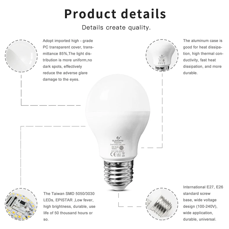 1. Мощность: 6 Вт2. Напряжение: 100-240 В3. Срок службы: 50000 часов4. Диаметр: 57 мм5. Длина: 102 мм6.CCT: 2000-6500K7. Световой поток: 500LM-550LM8. Светоотдача: 90 лм/ВтCRI: 80 +9. Поддержка Tuya App/SmartThings App control10. Поддержка голосового управления Alexa Echo/Google Home через SmartThings hub или Tuya Zigbee hub11. Поддержка 2,4G RF дистанционного управления напрямую, без zigbee hub11. Подходит для гостиной, кухни, спальни, игровой комнаты, ванной комнаты, прихожей, магазина, торгового центра и т. д.