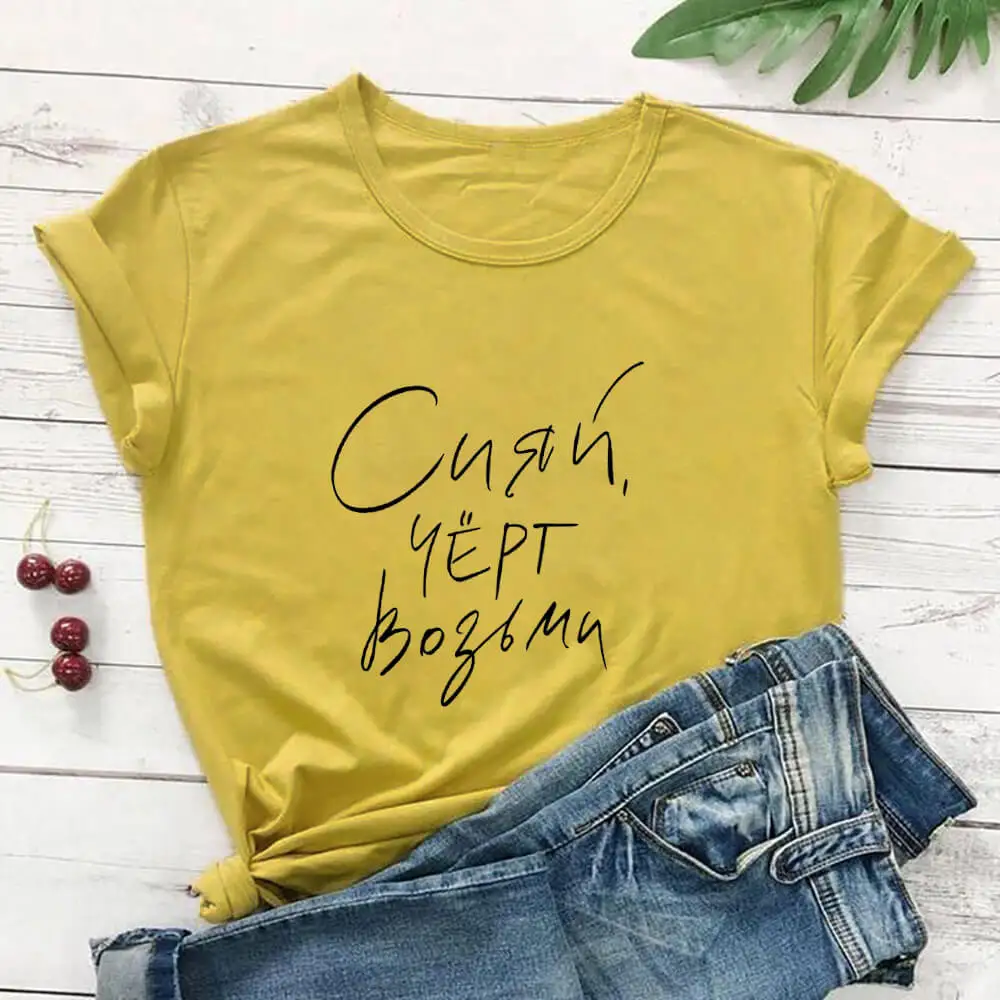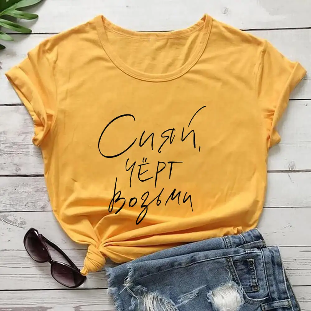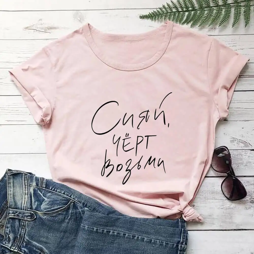 Сияй, черт возьми Женская футболка из 100% хлопка с русской кириллицей забавная летняя повседневная футболка унисекс с круглым вырезом футболка с короткими рукавами и надписью