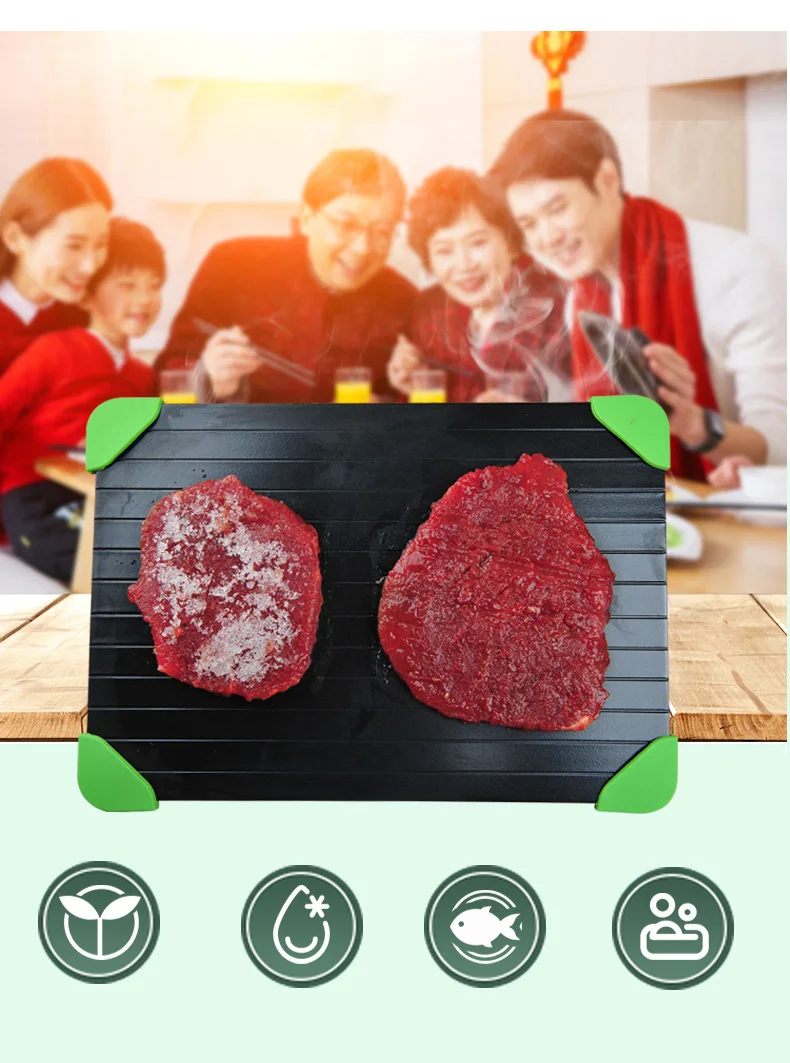 Размораживающий лоток для замороженных продуктов быстро в течение нескольких минут, оттепель куриной грудки, стейк, свиные отбивные, отбивные ягненка и многое другое в течение 30-60 минут в зависимости от толщины и контактной поверхности между мясом и тарелкой. Более мелкие и тонкие продукты, такие как бургеры, колбасы, креветки и бекон, могут разморозить еще быстрее.