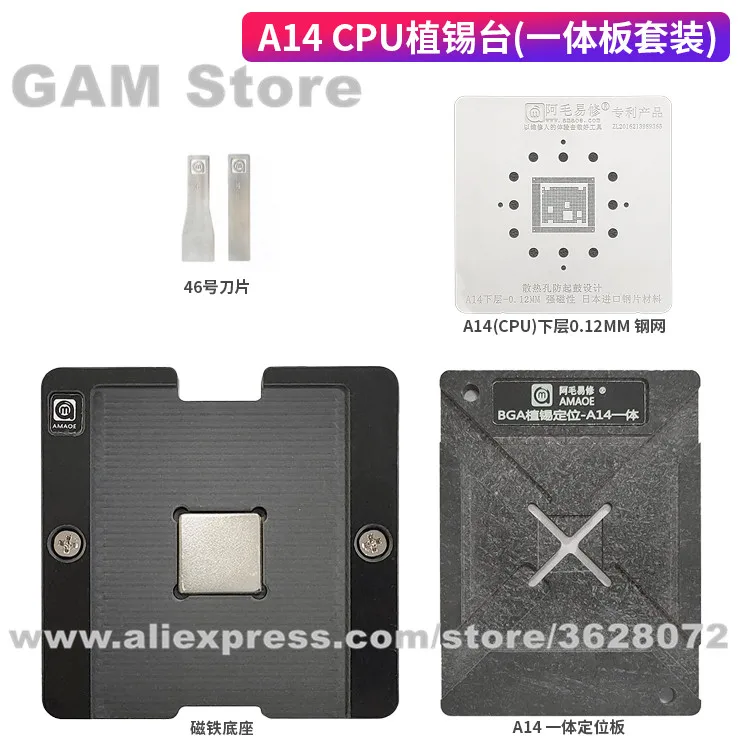 Описание:AMAOE A14 CPU RAM Reballing набор для iPhone 12 12pro 12promax 12mini Plate Steel Mesh Setting Tin Remove Glue Platform фиксированное приспособление