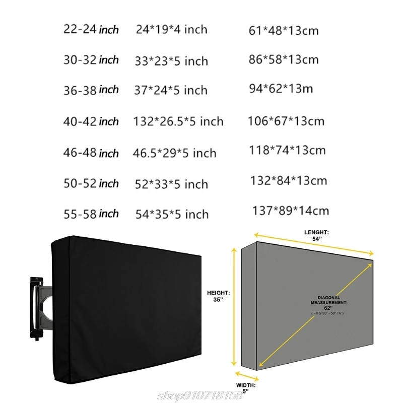 Уличная крышка для экрана телевизора всепогодный Универсальный защитный пыленепроницаемый водонепроницаемый чехол для ЖК-телевизора от 22 до 58 дюймов с 193C100% новый и высокое качествоОсобенности:Независимо от того, решите ли вы поставить телевизор на патио, на открытой террасе или у бассейна, этот чехол для телевизора обеспечивает защиту всех сезонов для вашего ценного плоского телевизора.Выдерживает жесткие погодные условия, защищает ваш телевизор от пыли, насекомых, УФ-лучей, льда и конденсации.Изготовлен из ткани Оксфорд с водонепроницаемым ПВХ покрытием, позволяет ему «дышать», сохраняя при этом воду, ветер и влагу. Усиленная строчка означает, что крышка телевизора сохраняет форму.Это означает, что плесень и влажность не накапливаются под крышкой из-за изменения температуры окружающей среды или влажности. В результате ваш телевизор не поврежден и не поврежден из-за «пота».Более мягкая внутренняя подкладка и удобный карман с дистанционным управлением означает, что у вас есть идеальный чехол, чтобы ваш телевизор был защищен один год.Наш универсальный чехол подходит практически для каждого настенного крепления, совместим с ЖК-дисплеем, светодиодный, плазменный телевизорСпецификация:Материал: ткань Оксфорд22-24 дюйма Размер: approx.61x48x13cm/24x19x5in30-32 дюймов Размер: approx.86x58x13cm/33x23x5in36-38 дюймов Размер: approx.94x62x13cm/37x24x5in40-42 дюймов Размер: approx.106x67x13cm/41.73x26.4x5in46-48 дюймов Размер: approx.118x74x13cm/46,5 x29x5in50-52 дюймов Размер: approx.132x84x13cm/52x33x5in55-58 дюймов Размер: approx.137x89x14cm/54x35x5.5inЦвет: черный, как показано на фотографииКоличество: 1 шт.Примечание:Нет розничной упаковки.Возможны отклонения в 0-1 см вследствие измерений вручную. Пожалуйста, убедитесь, что вы не возражаете, прежде чем сделать ставку.Из-за разницы между различными мониторами изображение может не отражать фактический цвет изделия. Спасибо!Посылка:1 x наружная ТВ-крышка (другие аксессуары на фото не включены.)