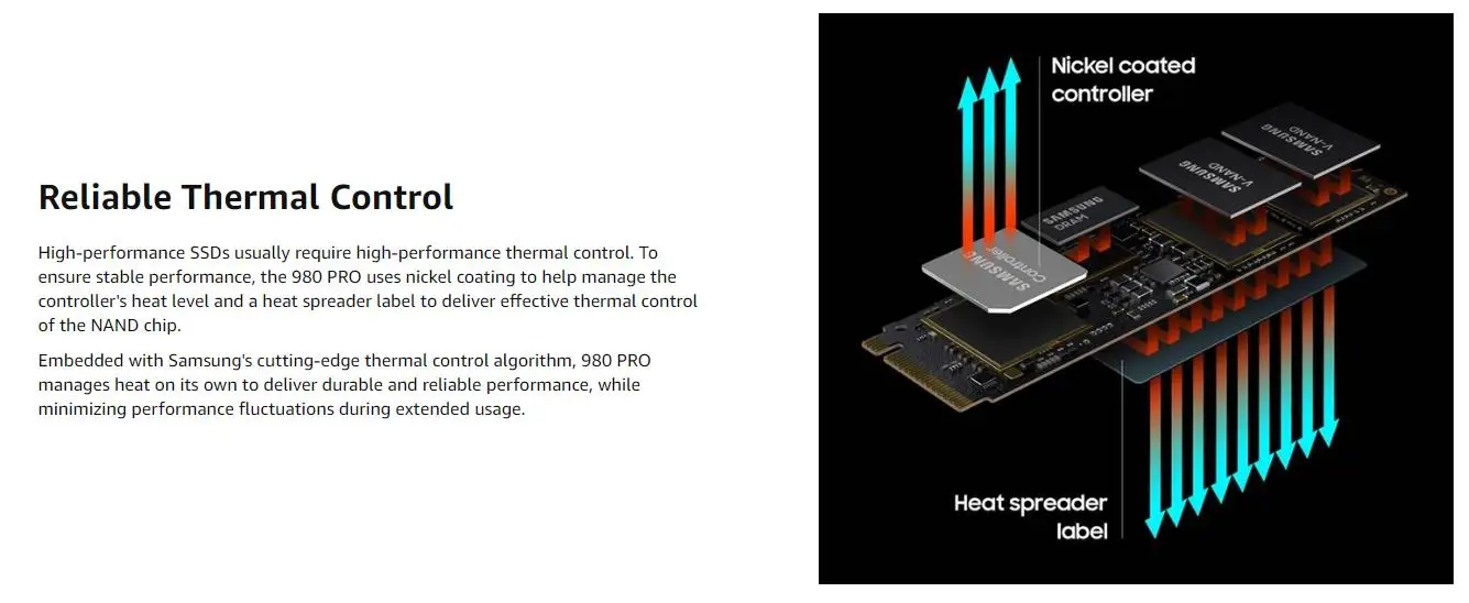 Для обеспечения стабильной работы 980 PRO использует никелевое покрытие для управления уровнем тепла контроллера и этикетку теплораспределителя для обеспечения эффективного теплового контроля микросхемы NAND