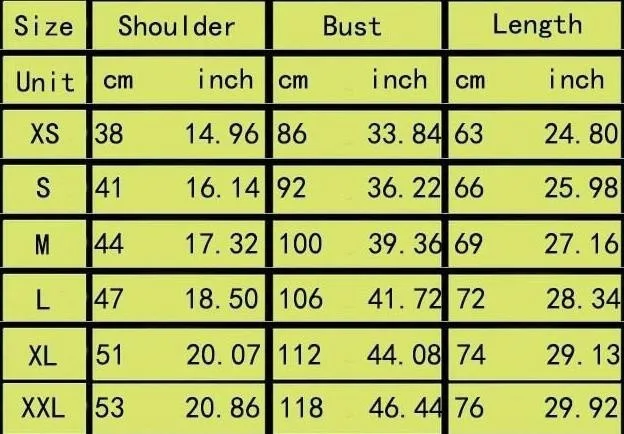 Размер плеч/см обхват груди/см длина/см Подходящая высота XS 38 44 60 160 см S 39 45 62 165 см M 40 50 64 170 см L 42 53 64,5 175 см XL 47 56 65 180 см XXL 48 59 68 185 см