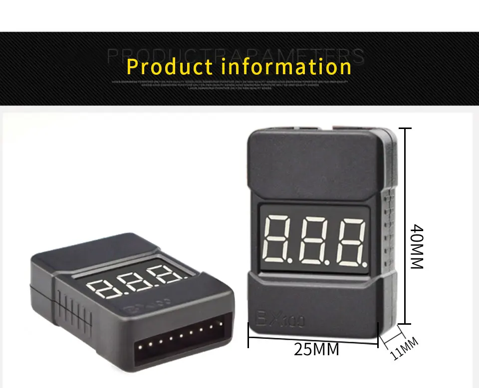 Вес: 14 гРазмер: 44*32*14 ммДисплей: светодиодныйНапряжение обнаружения Точность: ± 0,01 VБлок напряжение Диапазон отображения: 0,5-4,5 VОбщее напряжение Диапазон отображения: 0,6-36V1S тестовый режим Диапазон напряжения: 3,7-30 вРежим сигнализации низкого напряжения для: 2-8SДиапазон значений набора сигнализации: OFF-2.7-3.8V