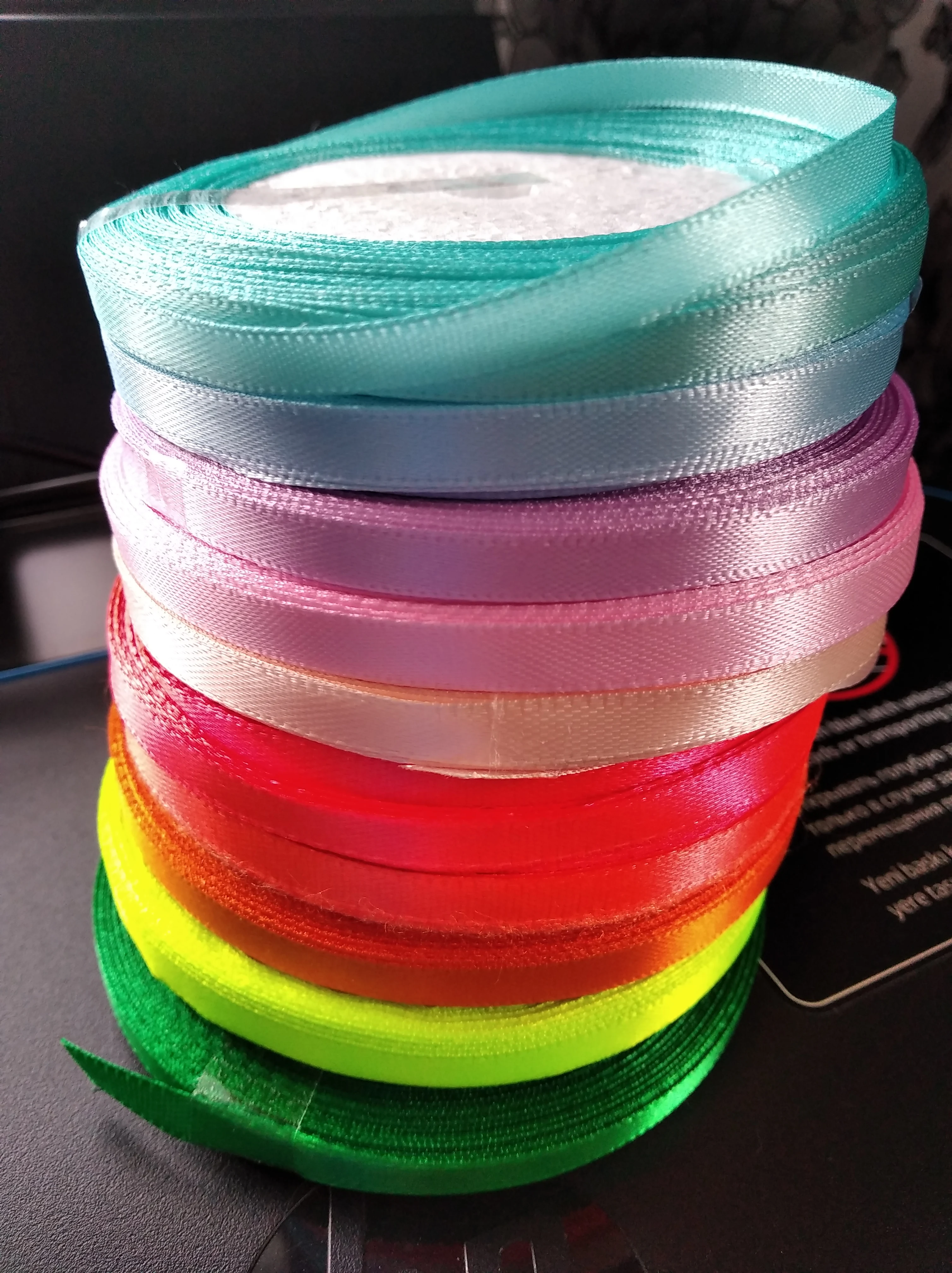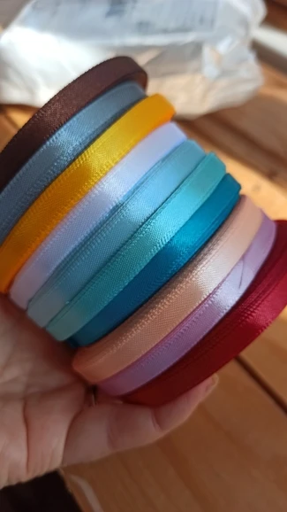 Заказала десять бобин разных цветов. Плюсы: очень быстрая доставка, до Омской области меньше трех недель. Ленты яркие, по метражу думаю все нормально, мерить не буду. Минусы: плохо упаковано, в пакете было много свободного места, из-за этого пара бобин с лентами развалились пополам, они отдельно не были упакованы. Фиолетовый и оба голубых цвета не соответствуют цвету на картинке. Остальные 7 - все нормально. И одна сторона оранжевой ленты ворсистая, но при пользовании, думаю, неудобств не будет. В целом товаром довольна, для меня недостатки некритичны.
