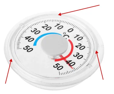 Двухсторонний скотч настолько тонкий, что приклеить термометр на стекло не получится. я взял напильник и стер пластиковую кромку по кругу, тогда место приклеивания коснется окна с обратной стороны пластик прозрачный отверстия для воздуха большие, поэтому насекомые могут залезть в термометр и там остаться :( но, в целом, термометр красивый, свои функции выполняет