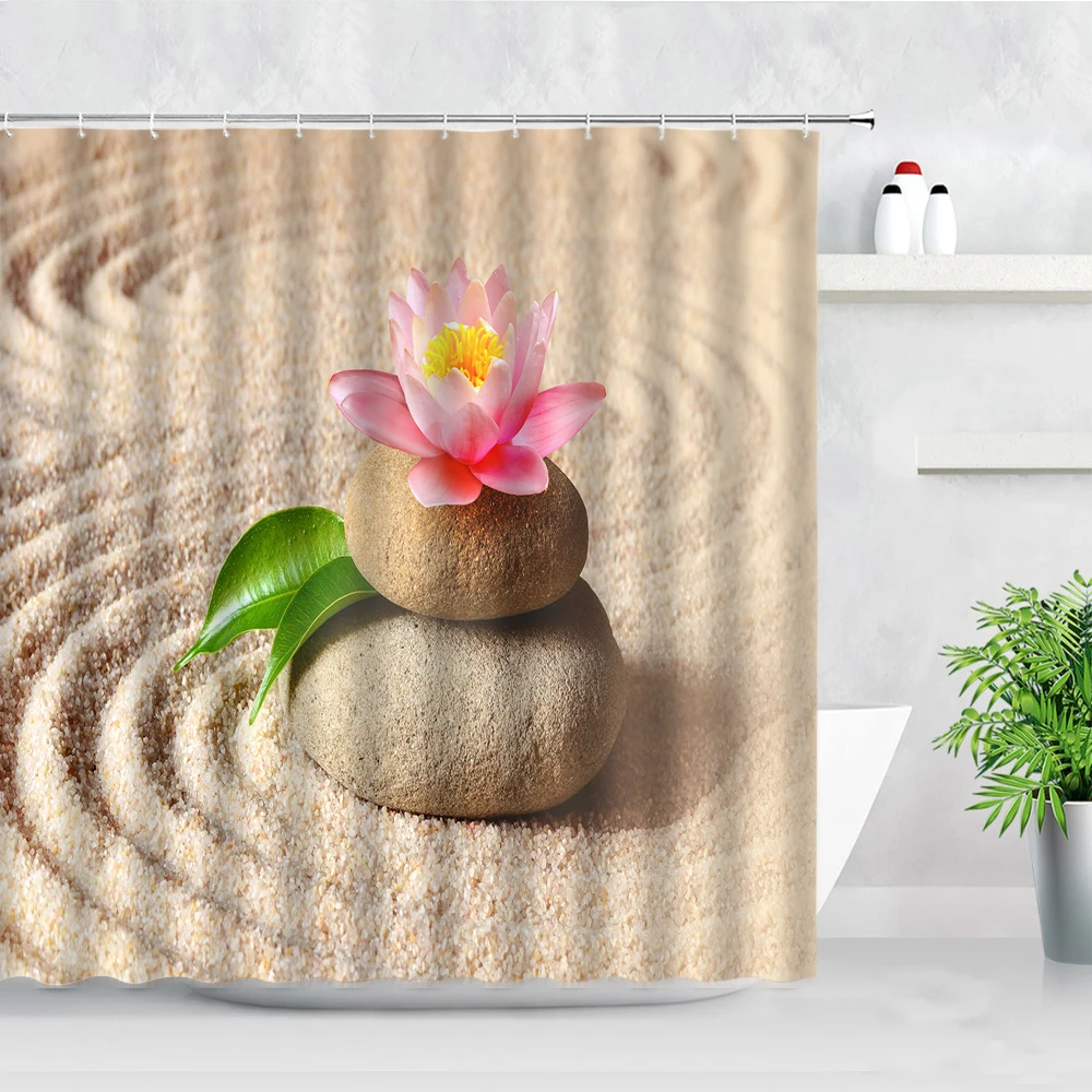 Zen занавеска для душа, зеленые растения, бамбуковые листья, галька...