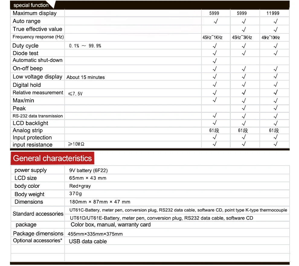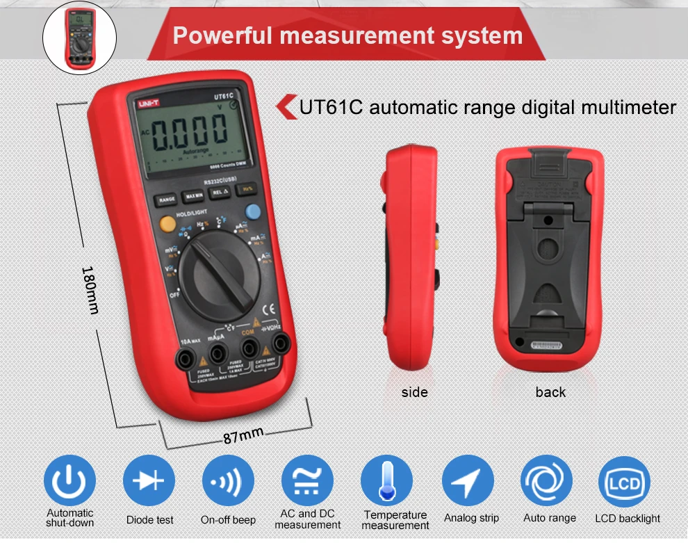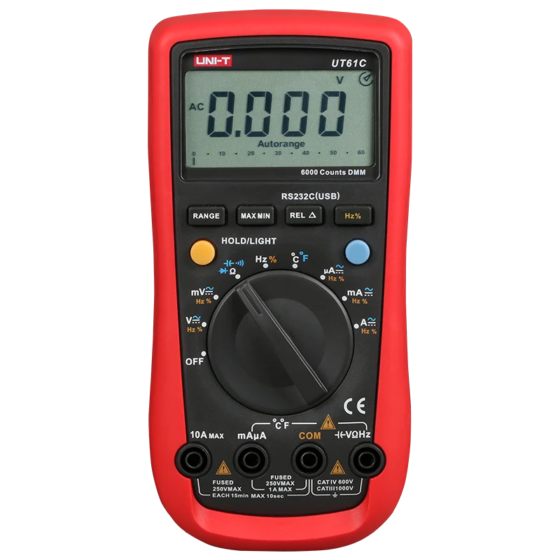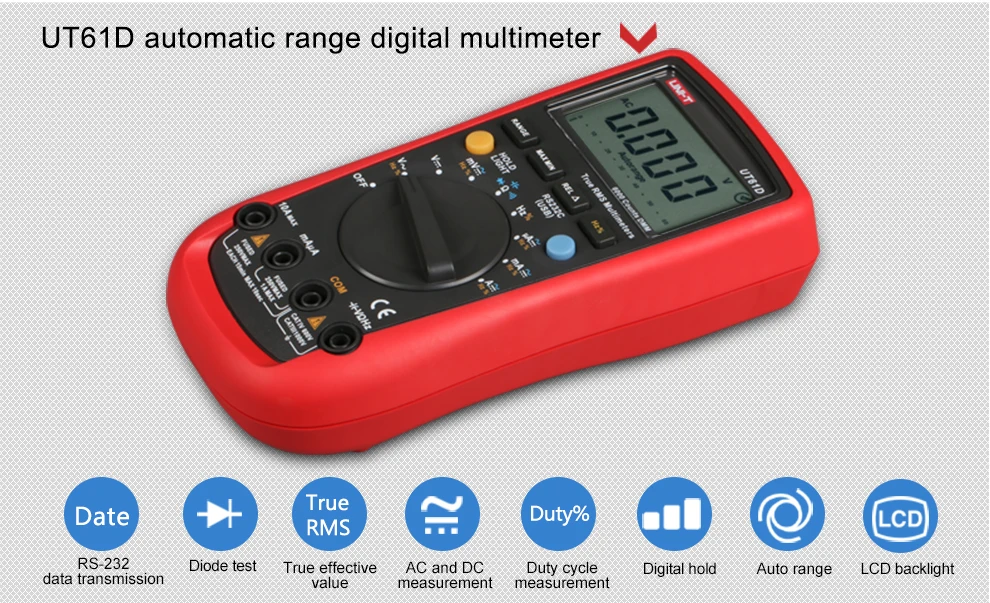 UT61D Современный цифровой мультиметр (Прекращено)Серия UT61 соответствует стандартам CE, ETL и GS. Эта серия представляет собой Автоматический диапазон с возможностью выбора истинных моделей RMS (UT61D/E). Эта серия имеет множество функций и сочетается с высокой степенью безопасности CAT IV 600V. Подходит для современных электронных и электрических пользователей.Опасения:1. Автоматический диапазон2. Макс/мин/режим REL3. Автоматическое выключение питания4. ЖК-подсветка5. RS-232 и usb-интерфейс6. Аналоговый бар7. NCV (UT61A)8. Индикация низкого заряда батареи9. True RMS10. Диод/Непрерывный зуммер11. Хранение данных12. Входная защита13. Датчик температуры k-типа (только UT61C)
