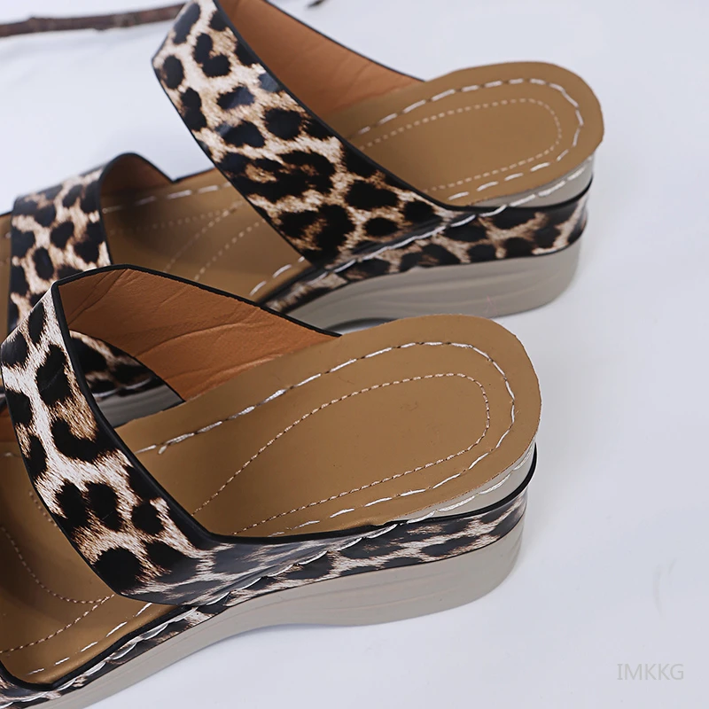 Женские модные шлепанцы без задника с открытыми пальцами на танкетке с леопардовым принтом и открытым носком; Пляжная обувь, римские сандалии с открытым носком; Пляжная обувь без шнуровки на море шлёпанцы для женщин размера плюс 43
