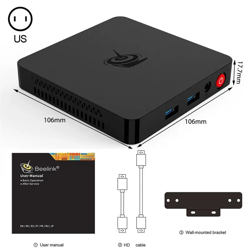 Посылка включает в себя:1 х мини-ПК1 х адаптер питания1 x Мини-кронштейн для ПК2 x HD кабель1 x Руководство пользователя