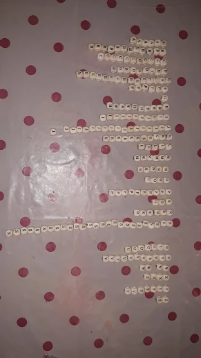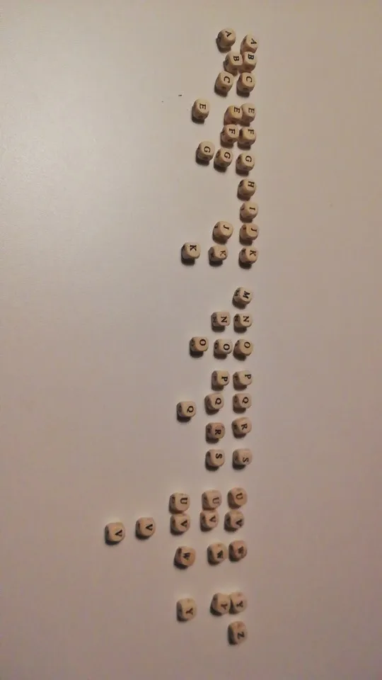 Я очень разочарован. Потому что у меня нет всех букв алфавита, я даже не могу написать имя, которое я хотел поставить. Я скучаю по E,M,O,R,T,U. Кроме того, у меня есть только один I, один L, один S ..... Я прилагаю вам фото