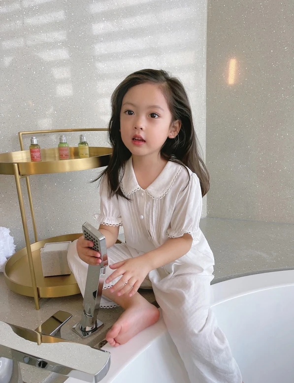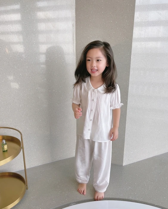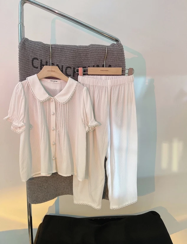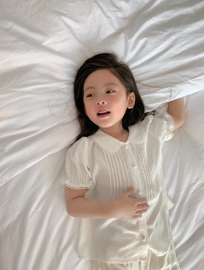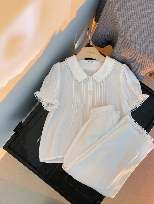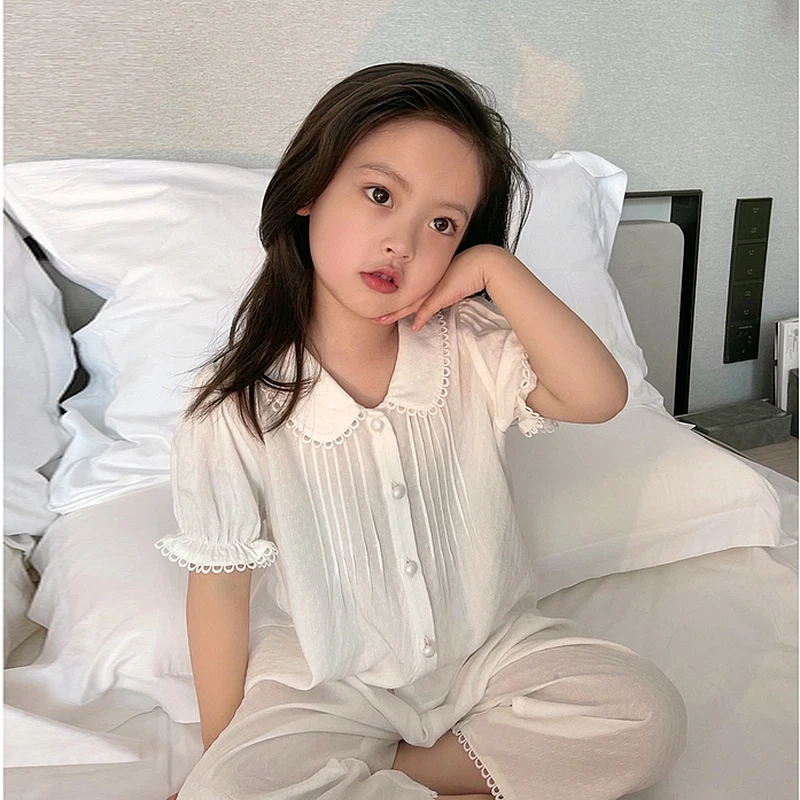 Пижама с отложным воротником для девочек, летняя белая плиссированная Пижама для малышей, милая домашняя одежда для сна, детская одежда