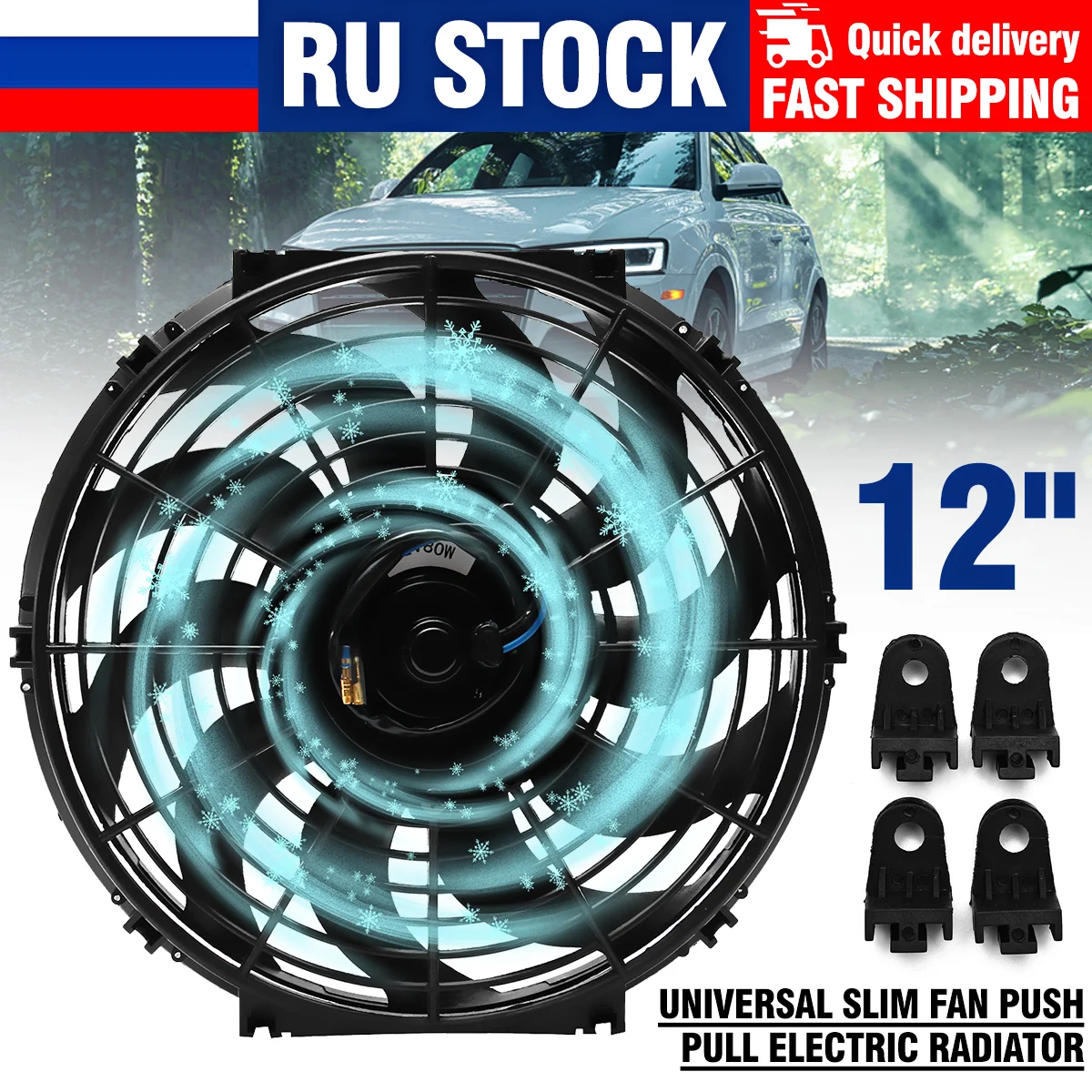 12 дюймовый универсальный тонкий вентилятор для автомобиля, электрический вентилятор радиатора, охлаждающий вентилятор, нажимной вытяжной изогнутый лопастной вентилятор радиатора, комплект для установки 80 Вт 12 В