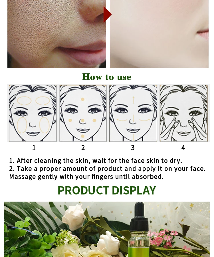 1. После очистки кожи подождите, пока кожа лица высохнет.2. Возьмите необходимое количество продукта и нанесите его на лицо.Мягко массируйте пальцами до впитывания.