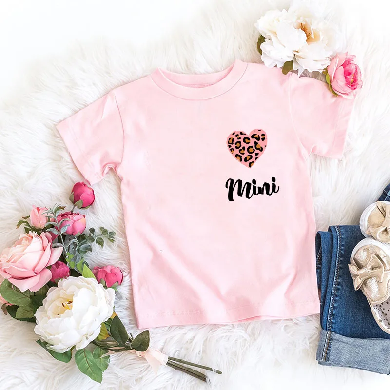 Одинаковые Семейные футболки с леопардовым принтом сердце футболка Мама и я Топы для женщин и девочек, летняя одежда для всей семьи рубашки для мамы и дочки