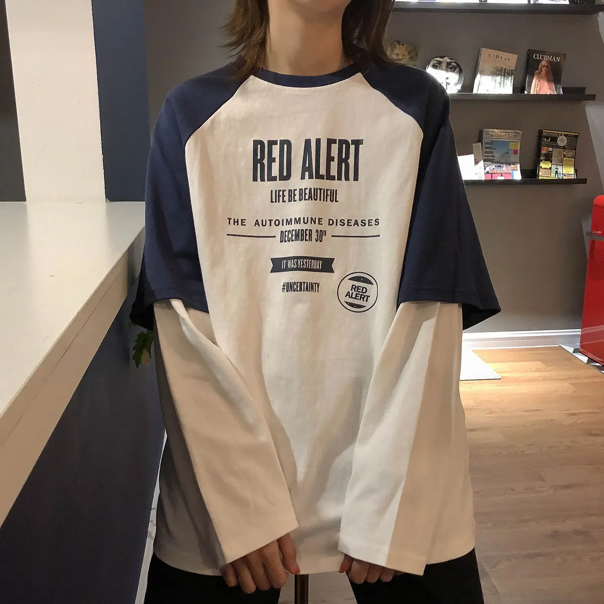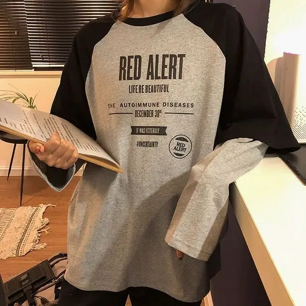 Футболка большого размера, футболка из двух частей, y2k, женские топы с длинным рукавом, топ с круглым вырезом в стиле ретро, стиль Харадзюку