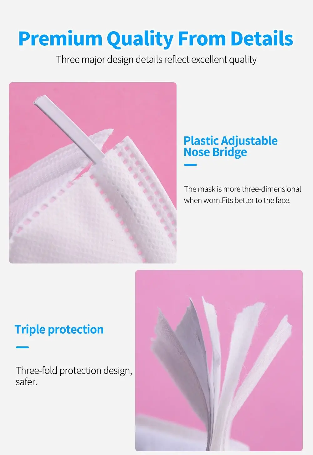 Особенности: Материал:Изготовлен из высококачественного материала, приятного для кожи, дышащего. Дышащие:Регулируемые зажимы для носа обеспечивают плотное уплотнение. Хорошее качество:Полностью герметичный для лучшей защиты. Дышащие и удобные в носке. Удобно носить:Эластичные ушные петли без давления на уши. Применение:Идеально подходит для повседневного занятия спортом на открытом воздухе, прогулок, пеших прогулок, верховой езды, прогулок, работы, школы и многого другого. Материал:Нетканая ткань + фильтрующий слой Стандарт:GB2626-2006 Класс защиты:Маска kn95 ffp2 Скорость фильтрации:Больше или равен 95%. Примечания:1) маска может немного отличаться от изображений в некоторых частях, стратуре и цвете и т. д. из-за различного производственного периода и некоторых улучшений, спасибо за ваше понимание.2) смешанные стили в продаваемой упаковке случаются иногда (но все маски имеют одинаковые функции и похожие структуры), спасибо за ваше понимание.5-Слои высокой плотности фильтрации5-ти слойной фильтрации эффективно препятствует воздействию пыли, микробы, изумрудно-зеленый,PM2.5 в воздухе, решить проблемы с дыханием сразу.1. Наружный слой нетканого материалаБлоки летучей пыли и т. Д.2. Высокоэффективный фильтр из хлопкаФильтр больших частиц3. Мелтдутый тканевый фильтр-слойСкорость фильтра больше или равна 95%4. Высокоэффективная мелтдувная фильтровальная тканьФильтр мелких частиц5. Мягкая дышащая тканая тканьЛегкий для дыхания, приятный для кожи 1. Нетканые материалы, используемые для изготовления масок, были протестированы для защиты окружающей среды. Цветная Нетканая ткань не содержит загрязнений и токсичных веществ. Однако из-за нежной кожи детей рекомендуется, чтобы люди с аллергией на кожу использовали цветные маски с осторожностью.2. Маски для детей в возрасте от 0 до 5 лет не имеют зажимов для носа. Маски для детей в возрасте 6-12 лет имеют зажимы для носа. Если лицо ребенка маленькое, рекомендуется отрегулировать ремешки уха, чтобы контролировать, насколько хорошо маска подходит для лица.3. Ввиду небольшой емкости легких детей, детские маски будут чувствовать себя тоньше, чем взрослые маски. Однако количество слоев фильтрации маски соответствует рекламе.