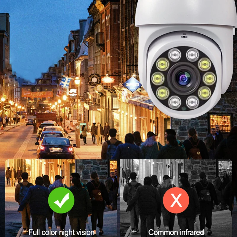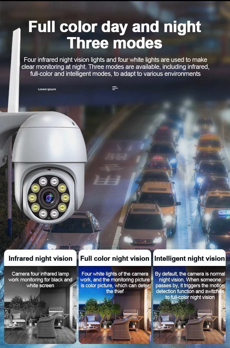 Четыре инфракрасных фонаря ночного видения и четыре белых фонаря используются для четкого мониторинга в ночное время. Доступны три режима, включая инфракрасный, полноцветный и интеллектуальный режимы, чтобы адаптироваться к различным условиям