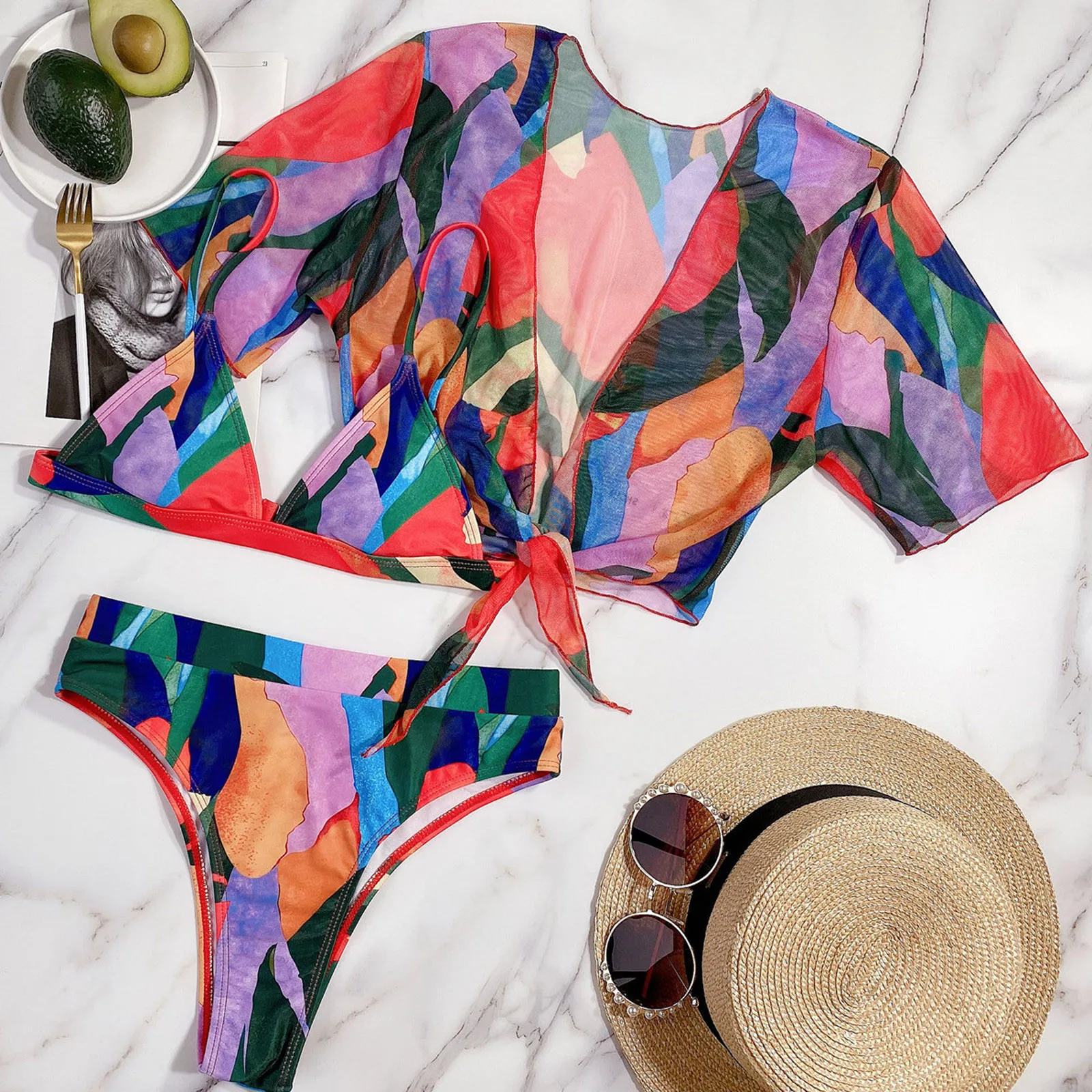 Женское модное пляжное купальное бикини, сексуальный раздельный купальник с принтом, комплект из 3 предметов
