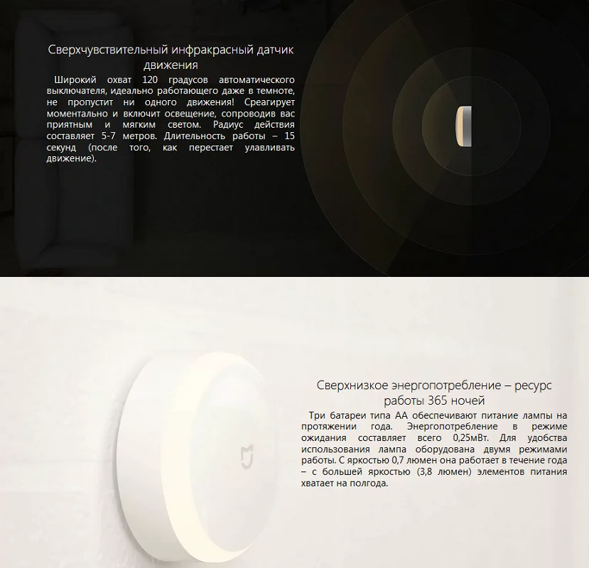 Беспроводная конструкция Xiaomi MiJia Induction Night Lamp открывает широкие возможности для использования осветительного прибора. Он может быть установлен буквально в любом месте – на стене или потолке, в шкафу или на лестничном марше. Неважно, где он будет установлен – вне зависимости от этого, он будет освещать ваш дом на протяжении 365 ночей. Широкий охват 120 градусов автоматического выключателя, идеально работающего даже в темноте, не пропустит ни одного движения! Среагирует моментально и включит освещение, сопроводив вас приятным и мягким светом. Радиус действия составляет 5-7 метров. Длительность работы – 15 секунд (после того, как перестает улавливать движение). Так же предусмотрено два уровня яркости при освещение (переключатель). Три батареи типа АА обеспечивают питание лампы на протяжении года. Энергопотребление в режиме ожидания составляет всего 0.25 мВт. Для удобства использования лампа оборудована двумя режимами работы. С яркостью 0.7 люмен она работает в течение года – с большей яркостью (3.8 люмен) элементов питания хватает на полгода.