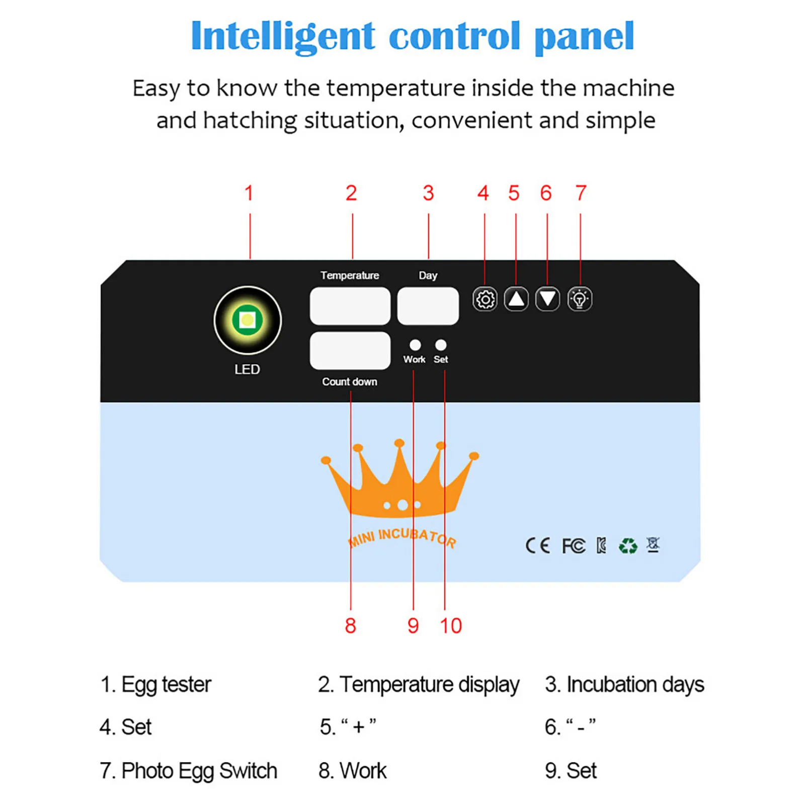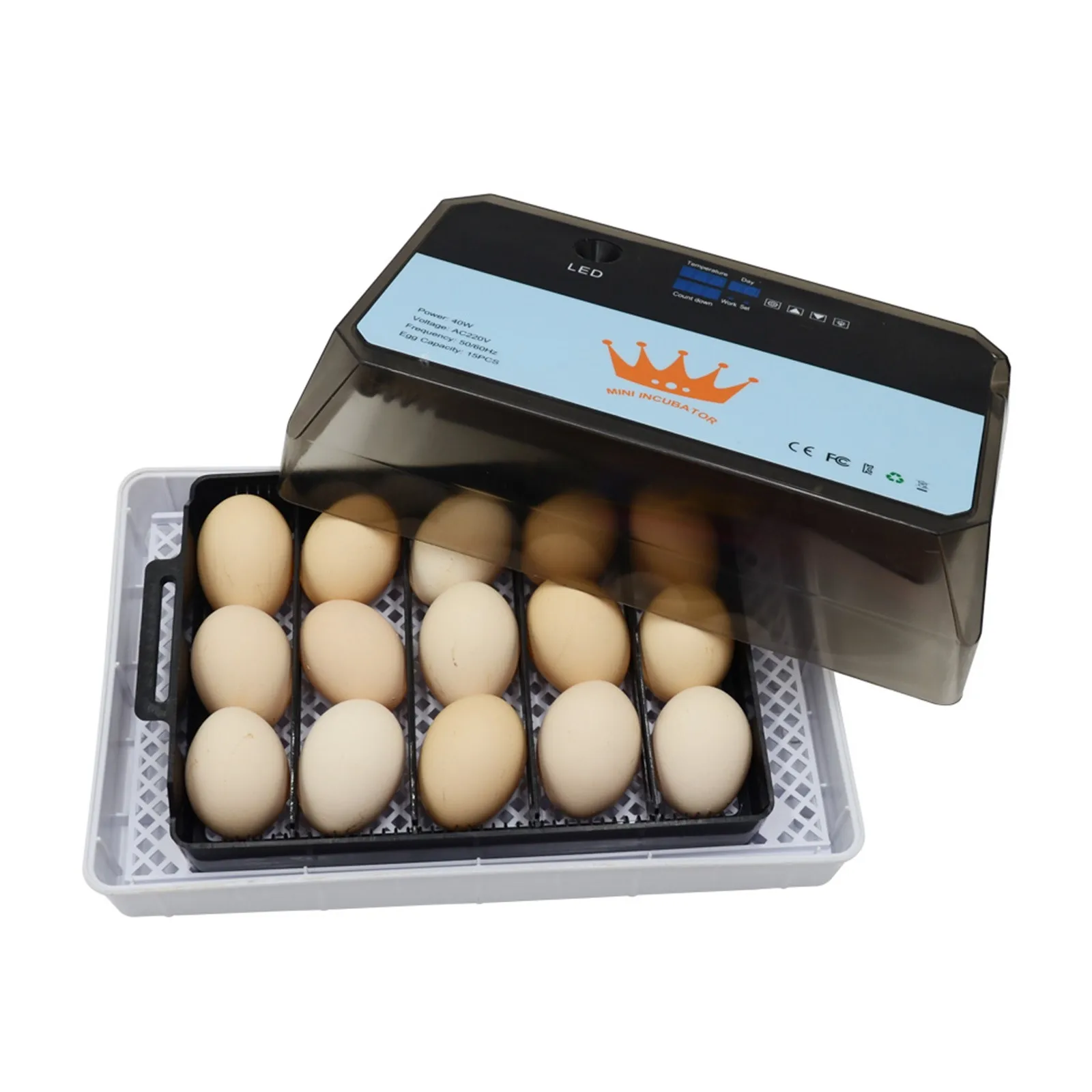 1. Три функции: Отображение температуры, инкубационные дни, время газирования. Когда клиенты используют его, они могут регулярно наблюдать за вращением яиц и выяснять Время инкубации и инкубации, что удобно для клиентов.