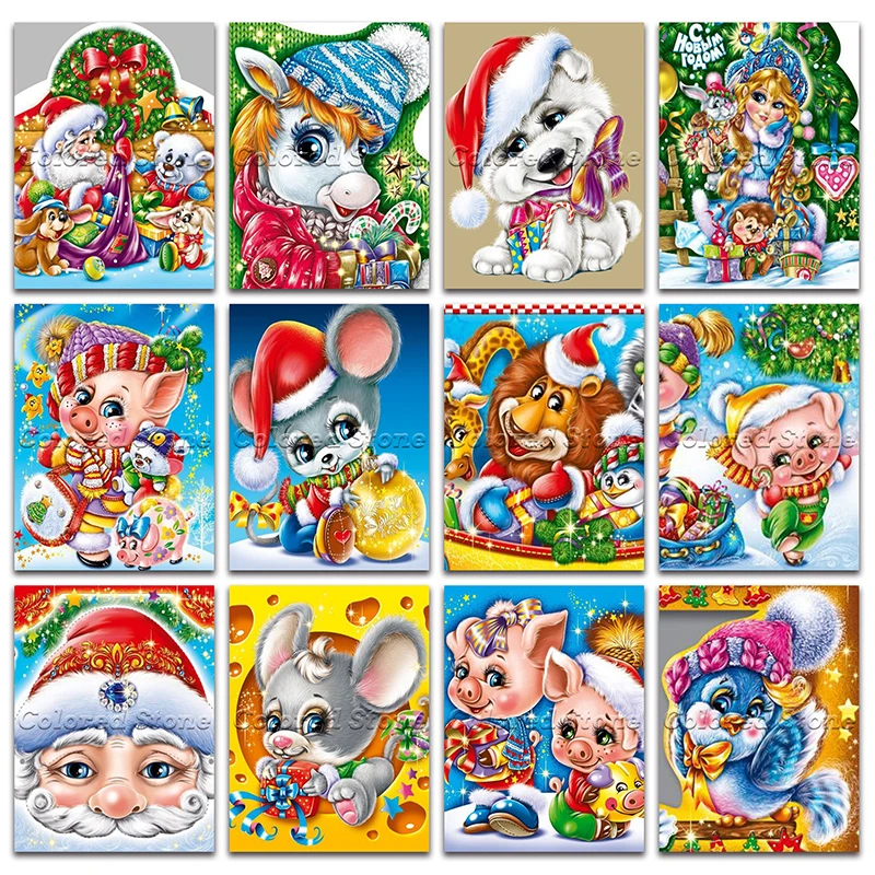 Алмазная живопись, мультяшная Рождественская картина, Санта, лошадь, собака, свинка, мышь, птица, 5D полноразмерная Вышивка крестиком, 3D Мозаика 713