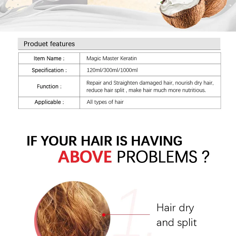 Название товара: волшебный мастер КератинСпецификация: 120 млФункция; Восстанавливает и выпрямляет поврежденные волосы, питает сухие волосы, уменьшает раскол волос, делает волосы гораздо более питательными.Применимо: все типы волос