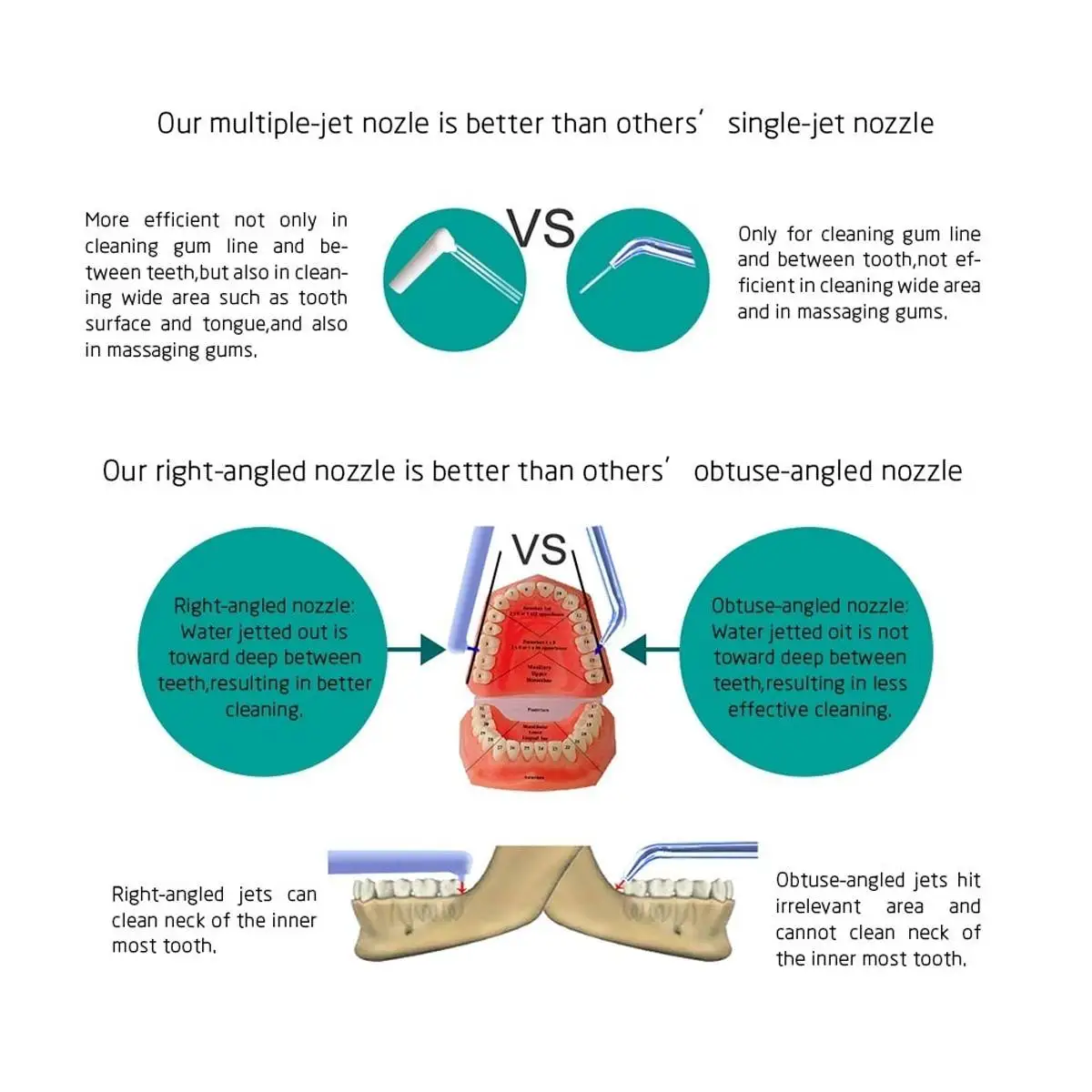 Особенности:1. Может регулировать давление воды.2. Может вращаться на 360 градусов после установки.3. Предоставляем не только одну струю, но и тройную струю.4. Уникальные Угловые струи могут очищать шею от самого внутреннего зуба.5. Угол струи воды 90 градусов, может помочь лучше очистить зубы.