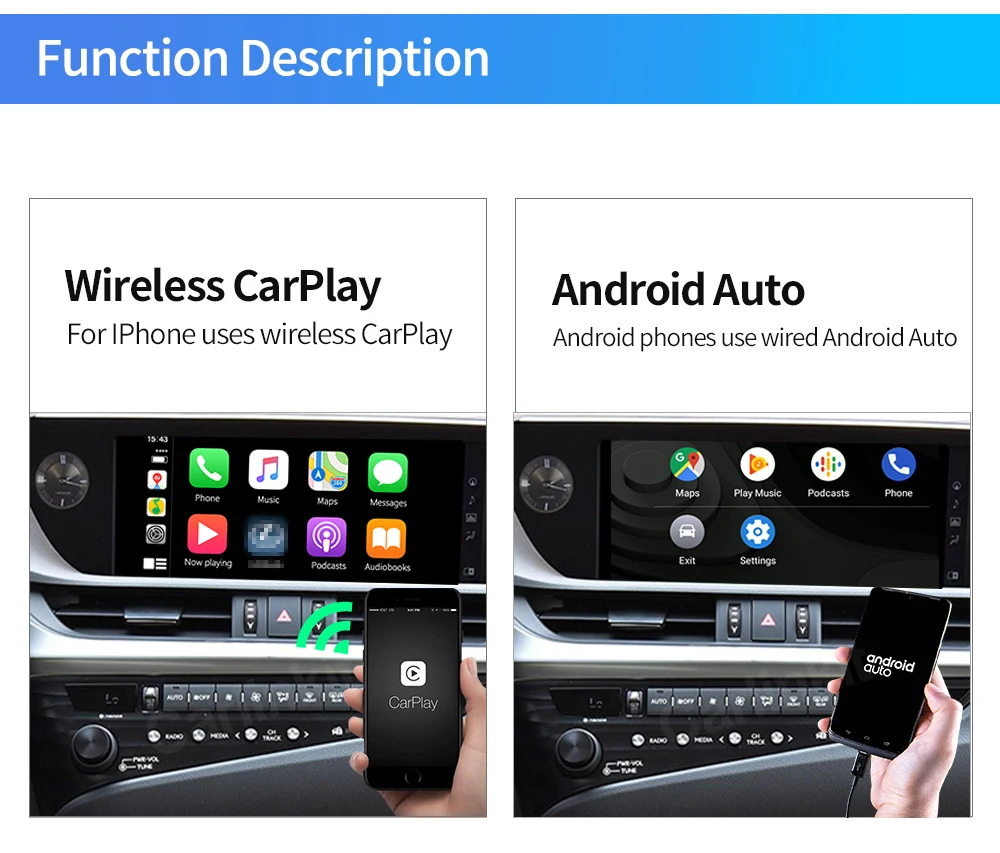 1. Беспроводная Apple CarPlay: сопряжение через Bluetooth, передача через WIFI.2. Проводной CarPlay: сначала выключите WIFI, подключите через кабель (вы также можете зарядить телефон через кабель)3. Android Auto: можно использовать Проводное и беспроводное подключение (беспроводное соединение поддерживает только некоторые мобильные телефоны)4. Зеркальное соединение: Поддержка телефонов iPhone и Android, вы можете использовать его для просмотра YouTube и других функций, доступных на любой мобильный телефон....==========================✔Поддержка для восстановления оригинального автомобиля OEM Кнопка/Управление ручкой/Управление рулевым колесом, по-прежнему оригинальный стиль вождения.✔Поддержка голосового управления: вам нужно только сказать «Hey Siri...», чтобы сделать ваш автомобиль лучше понять вас.✔Поддержка предпродажного/заднего/360 входного сигнала камеры. (Поддержка динамического руководства)✔Поддержка флеш-накопителя USB, вам нужно только вставить u-диск в usb-порт комплекта Carlinkit.✔Поддержка регулировки эквалайзера. Лучшее качество звука. Свободно Выбирайте свой любимый стиль (поп, рок, мягкий, стандартный...)✔Поддержка музыкального приложения: Spotify, Apple Music, Amazon и т. д. аудио через фабричные Audi media и некоторые приложения отображают текст.✔Поддержка gps-навигационного приложения, Google Maps, Waze и Apple Maps доступны, информация о дорожном движении в реальном времени....